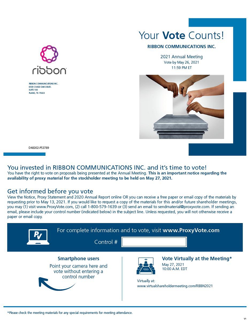 COMMUNICATIONS INC. 6500 CHASE OAKS BLVD. SUITE 100 PLANO, TX 75023D48302-P53789You invested in RIBBON COMMUNICATIONS INC. and it’s