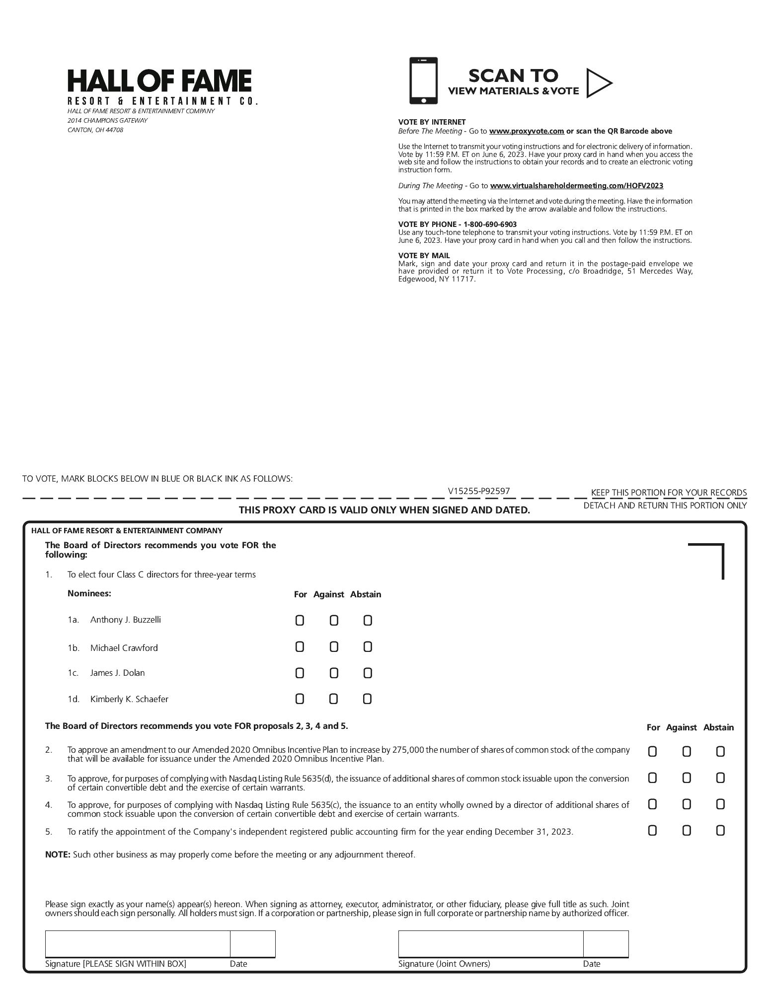 | Mr. Lichter beneficially owns 4,543 shares of Common Stock issuable upon the exercise of 100,000 Series B warrants he holds with an exercise price of $30.81 per share. The Series B warrants are exercisable within 60 days. Mr. Lichter may be deemed to beneficially own (a) 751,168 shares of Common Stock through his indirect ownership of membership interests in CH Capital Lending, LLC, (b) 15,950 shares of Common Stock through his indirect ownership of membership interests in IRG, LLC, (c) 5,681 shares of Common Stock through his beneficial ownership of membership interests in Midwest Lender Fund, LLC, (d) 455,867 shares of Common Stock issuable to CH Capital Lending, LLC upon the exercise of Series C warrants with an exercise price of $12.77 per share, (e) 111,321 shares of Common Stock issuable to CH Capital Lending, LLC upon the exercise of Series D warrants with an exercise price of $12.77 per share, (f) 45,419 shares of Common Stock issuable to CH Capital Lending, LLC upon the exercise of Series E warrants with an exercise price of $12.77 per share, (g) 454,407 shares of Common Stock issuable to CH Capital Lending, LLC upon conversion of 15,000 shares of Series C Preferred Stock with a conversion price of $33.01 per share, (h) 688,073 shares of Common Stock issuable upon conversion of a $8,786,700 term loan with a conversion price of $12.77 per share, (i) 822,626 shares of Common Stock issuable to CH Capital Lending, LLC upon conversion of a $10,504,941 bridge loan with a conversion price of $12.77 per share, (j) 334,654 shares of Common Stock issuable to IRG, LLC upon the conversion of $4,273,543.46 principal amount promissory note with a conversion price of $12.77 per share, (k) 22,709 shares of Common Stock issuable to IRG, LLC upon the exercise of Series E warrants with an exercise price of $12.77 per share, (k) 5,677 shares of Common Stock issuable to Midwest Lender Fund, LLC upon the exercise of Series G warrants with an exercise price of $33.01 per share, (l) 18,521 shares of Common Stock through his indirect control over American Capital Center, LLC, and (m) 70,546 shares of Common Stock issuable to CH Capital Lending, LLC upon the conversion of a $10,713,444 principal amount (as of April 13, 2023) convertible note of the Company with a conversion rate of 6.5849 shares of Common Stock per $1,000 principal amount. The convertible notes, the Series C Preferred Stock, the term loan and the bridge loan are convertible, and the warrants are exercisable within 60 days. Mr. Lichter may also be deemed to beneficially own 683,083 shares of Common Stock through his indirect ownership interest in IRG Canton Village Member, LLC, which in turn owns approximately a 76.8% interest in HOF Village, LLC. HOF Village, LLC owns 683,083 shares of Common Stock. He may also be deemed to beneficially own 157,085 shares of Common Stock issuable upon the exercise of 2,432,500 Series A warrants held by HOF Village, LLC with an exercise price of $253.11 per share. The Series A warrants are exercisable within 60 days. Mr. Lichter disclaims beneficial ownership of all shares held by IRG Canton Village Member, LLC, CH Capital Lending, LLC, IRG, LLC, Midwest Lender Fund, LLC, American Capital Center, LLC, and IRG Canton Village Manager, LLC, except to the extent of any actual pecuniary interest. For purposes of calculating his percentage ownership, the shares outstanding of the Company include the shares of Common Stock issuable upon the Series B warrants to Mr. Lichter, upon the Series C, Series D and Series E warrants to CH Capital Lending, LLC, upon the Series C Preferred Stock to CH Capital Lending, LLC, upon the term loan to CH Capital Lending, LLC, upon the bridge loan to CH Capital Lending, LLC, upon the Series G warrants to Midwest Lender Fund, LLC, upon the Series A warrants to HOF Village, LLC, upon the convertible note to CH Capital Lending, LLC, upon the convertible note to IRG, LLC, and upon the Series G warrants to Midwest Lender Fund, LLC. |