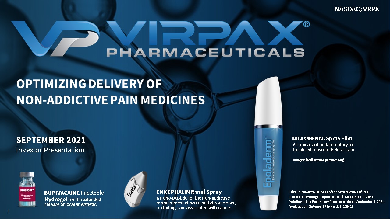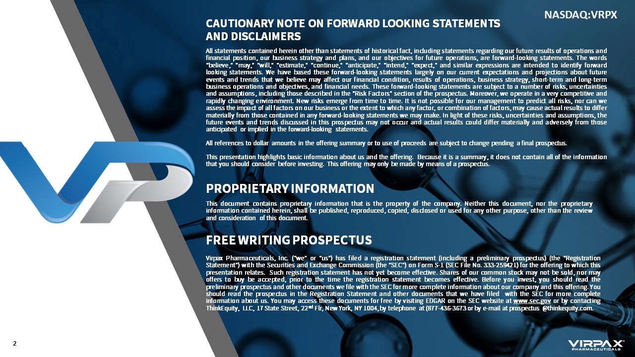 CAUTIONARY NOTE ON FORWARD LOOKING STATEMENTS AND DISCLAIMERS All statements contained herein other than statements of historical fact, including statements regarding our future results of operations and financial position, our business strategy and plans, and our objectives for future operations, are forward - looking statements . The words “believe,” “may,” “will,” “estimate,” “continue,” “anticipate,” “intend,” “expect,” and similar expressions are intended to identify forward looking statements . We have based these forward - looking statements largely on our current expectations and projections about future events and trends that we believe may affect our financial condition, results of operations, business strategy, short - term and long - term business operations and objectives, and financial needs . These forward - looking statements are subject to a number of risks, uncertainties and assumptions, including those described in the “Risk Factors” section of the prospectus . Moreover, we operate in a very competitive and rapidly changing environment . New risks emerge from time to time . It is not possible for our management to predict all risks, nor can we assess the impact of all factors on our business or the extent to which any factor, or combination of factors, may cause actual results to differ materially from those contained in any forward - looking statements we may make . In light of these risks, uncertainties and assumptions, the future events and trends discussed in this prospectus may not occur and actual results could differ materially and adversely from those anticipated or implied in the forward - looking statements . All references to dollar amounts in the offering summary or to use of proceeds are subject to change pending a final prospectus . This presentation highlights basic information about us and the offering . Because it is a summary, it does not contain all of the information that you should consider before investing . This offering may only be made by means of a prospectus . PROPRIETARY INFORMATION This document contains proprietary information that is the property of the company . Neither this document, nor the proprietary information contained herein, shall be published, reproduced, copied, disclosed or used for any other purpose, other than the review and consideration of this document . 2 Virpax Pharmaceuticals, Inc . (“we” or “us”) has filed a registration statement (including a preliminary prospectus) (the “Registration Statement”) with the Securities and Exchange Commission (the “SEC”) on Form S - 1 (SEC File No . 333 - 259421 ) for the offering to which this presentation relates . Such registration statement has not yet become effective . Shares of our common stock may not be sold, nor may offers to buy be accepted, prior to the time the registration statement becomes effective . Before you invest, you should read the preliminary prospectus and other documents we file with the SEC for more complete information about our company and this offering . You should read the prospectus in the Registration Statement and other documents that we have filed with the SEC for more complete information about us . You may access these documents for free by visiting EDGAR on the SEC website at www . sec . gov or by contacting ThinkEquity , LLC, 17 State Street, 22 nd Flr, New York, NY 1004 , by telephone at ( 877 - 436 - 3673 or by e - mail at prospectus @thinkequity . com . FREE WRITING PROSPECTUS NASDAQ:VRPX