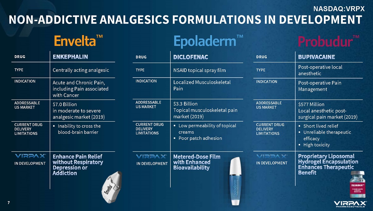 VIRPAX THERAPIES’ DRUG DELIVERY SYSTEMS THE IMPORTANT ROLE OF DRUG DELIVERY AND THE BENEFITS OF PROPRIETARY FORMULATIONS 6 NASDAQ:VRPX DELIVERY Facilitated drug delivery by transport along the olfactory neurons NOSE ACUTE AND CHRONIC PAIN, INCLUDING CANCER PAIN CONCEPT Multi - use device and pressurized single use cartridge ENKEPHALIN NANOPARTICLES Protected by Molecular Envelope Technology IMPROVED ONSET AND EXTENDED DURATION OF ACTION CONVENIENT, EASY - TO - APPLY