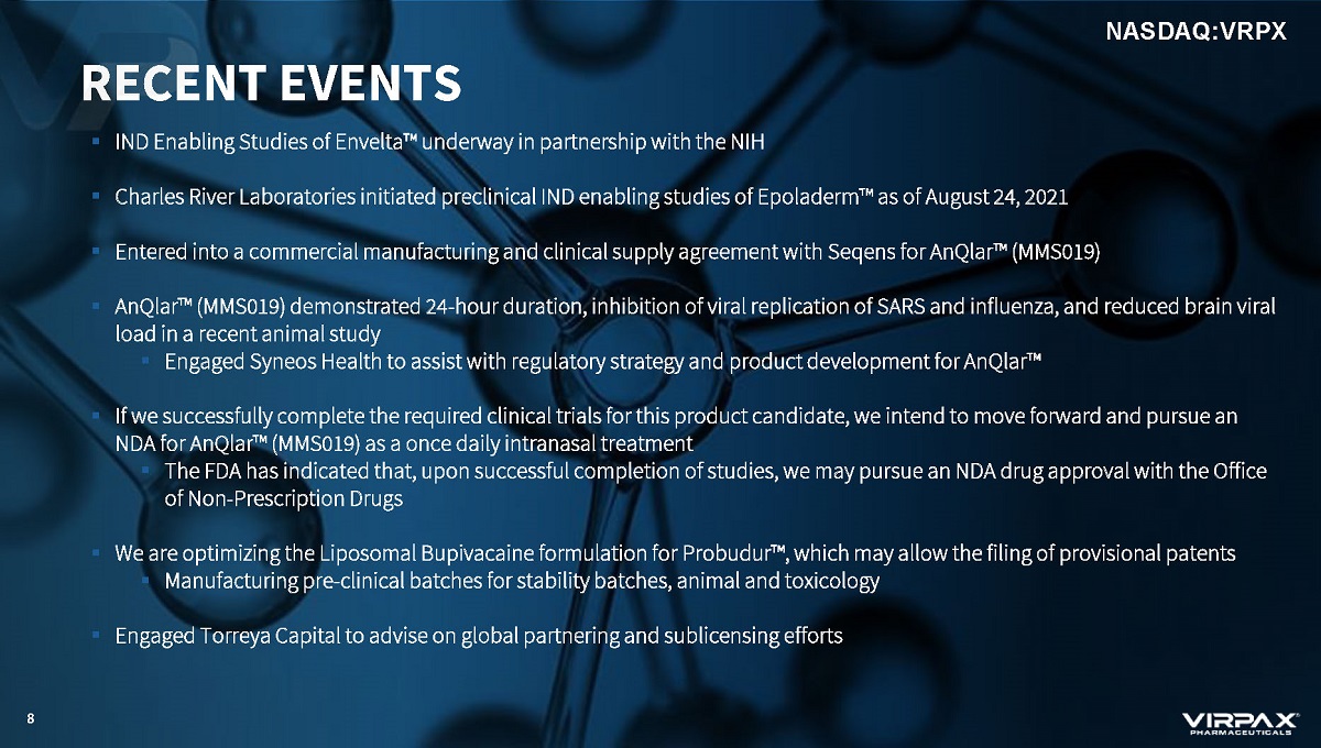 RECENT EVENTS 8 ▪ IND Enabling Studies of Envelta ҹ underway in partnership with the NIH ▪ Charles River Laboratories initiated preclinical IND enabling studies of Epoladerm ҹ as of August 24, 2021 ▪ Entered into a commercial manufacturing and clinical supply agreement with Seqens for AnQlar ҹ (MMS019) ▪ AnQlar ҹ (MMS019) demonstrated 24 - hour duration, inhibition of viral replication of SARS and influenza, and reduced brain viral load in a recent animal study ▪ Engaged Syneos Health to assist with regulatory strategy and product development for AnQlar ҹ ▪ If we successfully complete the required clinical trials for this product candidate, we intend to move forward and pursue an NDA for AnQlar ҹ (MMS019) as a once daily intranasal treatment ▪ The FDA has indicated that, upon successful completion of studies, we may pursue an NDA drug approval with the Office of Non - Prescription Drugs ▪ We are optimizing the Liposomal Bupivacaine formulation for Probudur ҹ , which may allow the filing of provisional patents ▪ Manufacturing pre - clinical batches for stability batches, animal and toxicology ▪ Engaged Torreya Capital to advise on global partnering and sublicensing efforts NASDAQ:VRPX