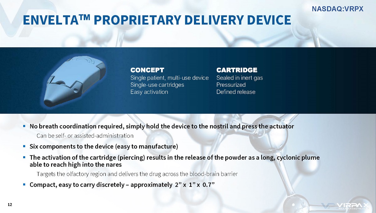 ENVELTA ҹ DELIVERS ENKEPHALIN NANOPARTICLES WITH MOLECULAR ENVELOPE TECHNOLOGY (MET) TECHNOLOGY & IP ▪ Leucine Enkephalin (L - ENK) nanoparticles in powdered form delivered through a novel intranasal device ▪ Expiry: 11/03/34 MARKET OPPORTUNITY ▪ Potentially disrupt opioid analgesic market for the treatment of acute and chronic pain, including pain associated with cancer ▪ Potential for treating post - traumatic stress disorder (PTSD) DEVELOPMENT PLAN ▪ NCE Regulatory Pathway ▪ Clinical Trials: Comparator – Morphine ▪ Entered into Cooperative Research and Development Agreement (CRADA) with National Center for Advancing Translational Sciences (NCATS) for continued development COMMERCIALIZATION PLAN ▪ Acute and Chronic Pain indications, including pain associated with cancer ▪ Outsourced manufacturing ▪ Targeting healthcare practitioners treating acute and chronic pain, including pain associated with cancer: Pain Specialists, Anesthesiologists, Orthopedists, PCPs, NPs/PAs, Oncologists and Neurologists 11 NASDAQ:VRPX