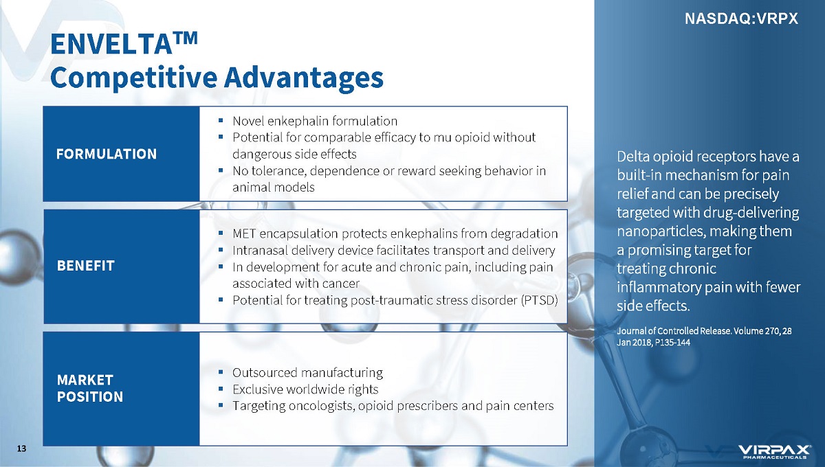 CONCEPT Single patient, multi - use device Single - use cartridges Easy activation CARTRIDGE Sealed in inert gas Pressurized Defined release ▪ No breath coordination required, simply hold the device to the nostril and press the actuator Can be self - or assisted - administration ▪ Six components to the device (easy to manufacture) ▪ The activation of the cartridge (piercing) results in the release of the powder as a long, cyclonic plume able to reach high into the nares Targets the olfactory region and delivers the drug across the blood - brain barrier ▪ Compact, easy to carry discretely – approximately 2” x 1” x 0.7” ENVELTA ҹ PROPRIETARY DELIVERY DEVICE 12 NASDAQ:VRPX