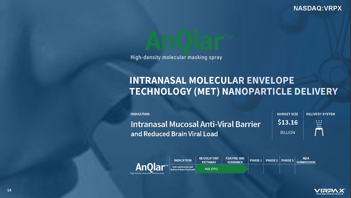 FORMULATION BENEFIT MARKET POSITION ▪ Novel enkephalin formulation ▪ Potential for comparable efficacy to mu opioid without dangerous side effects ▪ No tolerance, dependence or re ward seeking behavior in animal models ▪ MET encapsulation protects enkephalins from degradation ▪ Intranasal delivery device facilitates transport and delivery ▪ In development for acute and chronic pain, including pain associated with cancer ▪ Potential for treating post - traumatic stress disorder (PTSD) ▪ Outsourced manufacturing ▪ Exclusive worldwide rights ▪ Targeting oncologists, opioid prescribers and pain centers ENVELTA ҹ Competitive Advantages Delta opioid receptors have a built - in mechanism for pain relief and can be precisely targeted with drug - delivering nanoparticles, making them a promising target for treating chronic inflammatory pain with fewer side effects. Journal of Controlled Release. Volume 270, 28 Jan 2018, P135 - 144 13 NASDAQ:VRPX