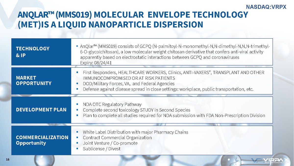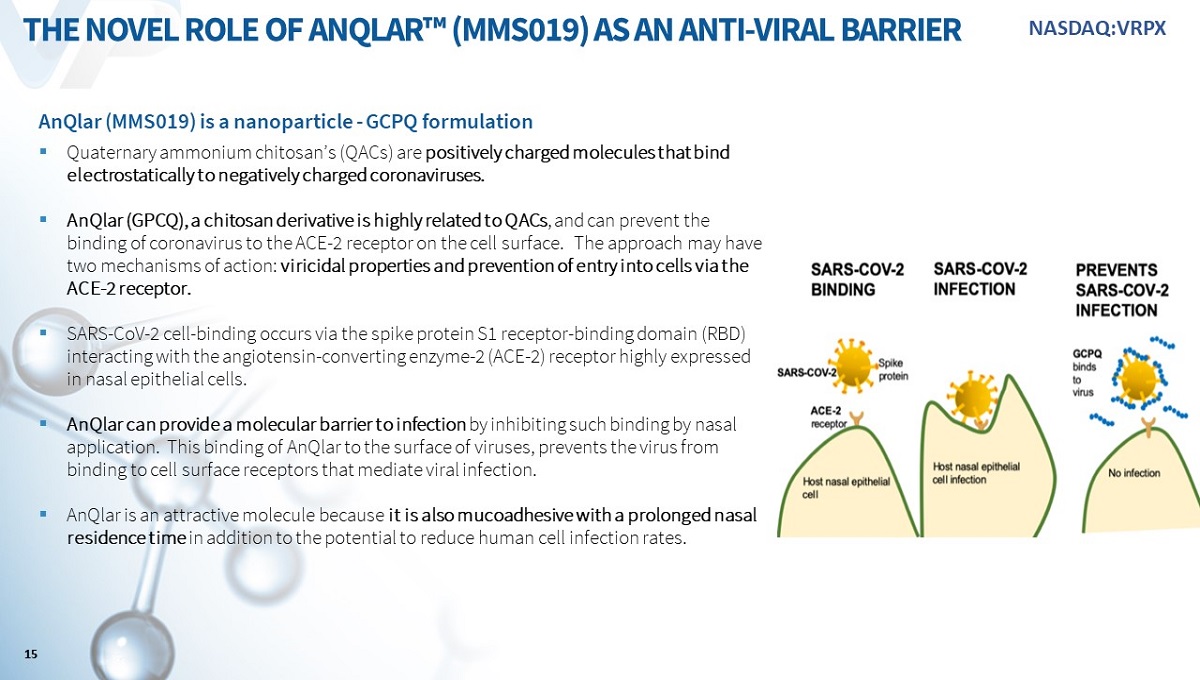 AnQlar (“MMS019”) is a nanoparticle - GCPQ formulation ▪ Quaternary ammonium chitosan’s (QACs) are positively charged molecules that bind electrostatically to negatively charged coronaviruses. ▪ AnQlar (GPCQ), a chitosan derivative is highly related to QACs , and can prevent the binding of coronavirus to the ACE - 2 receptor on the cell surface. The approach may have two mechanisms of action: viricidal properties and prevention of entry into cells via the ACE - 2 receptor. ▪ SARS - CoV - 2 cell - binding occurs via the spike protein S1 receptor - binding domain (RBD) interacting with the angiotensin - converting enzyme - 2 (ACE - 2) receptor highly expressed in nasal epithelial cells. ▪ AnQlar can provide a molecular barrier to infection by inhibiting such binding by nasal application. This binding of AnQlar to the surface of viruses, prevents the virus from binding to cell surface receptors that mediate viral infection. ▪ AnQlar is an attractive molecule because it is also mucoadhesive with a prolonged nasal residence time in addition to the potential to reduce human cell infection rates. THE NOVEL ROLE OF ANQLAR ҹ (MMS019) AS AN ANTI - VIRAL BARRIER 15 NASDAQ:VRPX