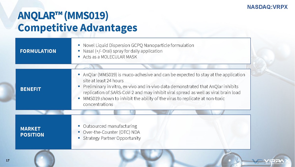 ANQLAR ҹ (MMS019) MOLECULAR ENVELOPE TECHNOLOGY (MET)IS A LIQUID NANOPARTICLE DISPERSION TECHNOLOGY & IP ▪ AnQlar ҹ ( MMS019) consists of GCPQ ( N - palmitoyl - N - monomethyl - N,N - dimethyl - N,N,N - trimethyl - 6 - O - glycolchitosan) , a low molecular weight chitosan derivative that confers anti - viral activity apparently based on electrostatic interactions between GCPQ and coro naviruses Expiry: 08/24/41 MARKET OPPORTUNITY ▪ First Responders, HEALTHCARE WORKERS, Clinics, ANTI - VAXERS”, TRANSPLANT AND OTHER IMMUNOCOMPROMISED OR AT RISK PATIENTS ▪ DOD/Military Forces, VA, and Federal Agencies ▪ Defense against disease spread in close settings: workplace, public transportation, etc. DEVELOPMENT PLAN ▪ NDA OTC Regulatory Pathway ▪ Complete second toxicology STUDY in Second Species ▪ Plan to complete all studies required for NDA submission with FDA Non - Prescription Division COMMERCIALIZATION Opportunity ▪ White Label Distribution with major Pharmacy Chains ▪ Contract Commercial Organization ▪ Joint Venture / Co - promote ▪ Sublicense / Divest 16 NASDAQ:VRPX