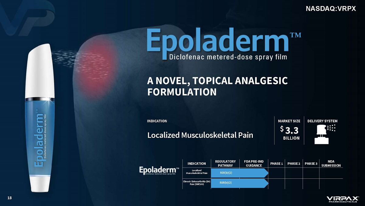 THE ANATOMY AND ACTION OF EPOLADERM w SPRAY FILM METERED - DOSE VALVE administers a therapeutic dose of diclofenac in an aerosolized spray CONCENTRATED DICLOFENAC SPRAY FILM with a high - level of adhesiveness, accessibility and skin - drying PRE - FILLED DEVICE WITH DICLOFENAC SOLUTION specially formulated for metered - dosing 20 SKIN PRE - FILLED DEVICE WITH DICLOFENAC SOLUTION Specially formulated for metered - dosing CONCENTRATED DICLOFENAC SPRAY FILM With a high - level of adhesiveness, accessibility and skin - drying DRYING TIMES Between 60 and 90 seconds CONVENIENT, EASY - TO - APPLY ..REMAINS ON THE SKIN AS A SPRAY FILM NASDAQ:VRPX