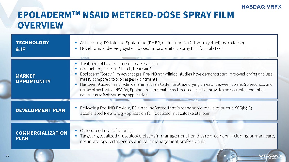 INDICATION REGULATORY PATHWAY FDA PRE - IND GUIDANCE PHASE 1 PHASE 2 PHASE 3 NDA SUBMISSION Localized Musculoskeletal Pain Chronic Osteoarthritis (OA) Pain (OSF200) INDICATION MARKET SIZE DELIVERY SYSTEM Localized Musculoskeletal Pain $ 3.3 BILLION 505(b)(2) A NOVEL, TOPICAL ANALGESIC FORMULATION 18 505(b)(2) NASDAQ:VRPX