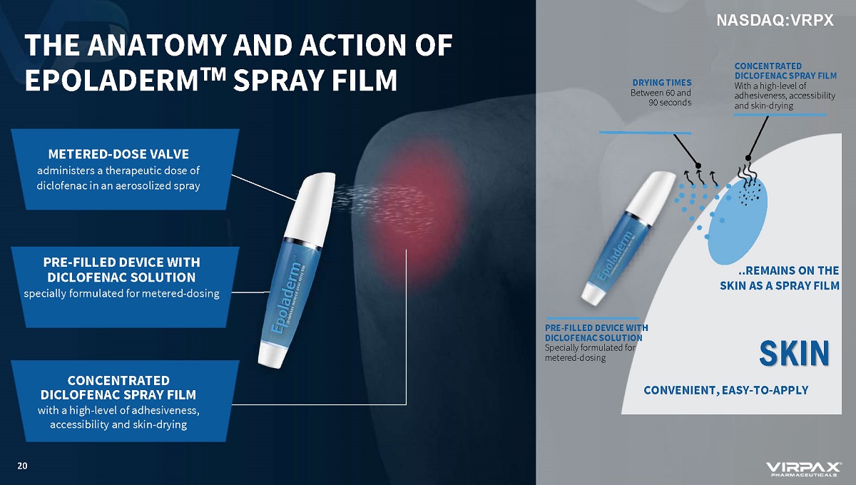 EPOLADERM ҹ NSAID METERED - DOSE SPRAY FILM OVERVIEW TECHNOLOGY & IP ▪ Active drug: Diclofenac Epolamine (DHEP, diclofenac - N - (2 - hydroxyethyl) pyrrolidine) ▪ Novel topical delivery system based on proprietary spray film formulation MARKET OPPORTUNITY ▪ Treatment of localized musculoskeletal pain ▪ Competitor(s): Flector® Patch; Pennsaid® ▪ Epoladerm ҹ Spray Film Advantages: Pre - IND non - clinical studies have demonstrated improved drying and less messy compared to topical gels / ointments ▪ Has been studied in non - clinical animal trials to demonstrate drying times of between 60 and 90 seconds, and u nlike other topical NSAIDs, Epoladerm may enable metered - dosing that provides an accurate amount of active ingredient per spray application DEVELOPMENT PLAN ▪ Following Pre - IND Review, FDA has indicated that is reasonable for us to pursue 505(b)(2) accelerated New Drug Application for localized musculoskeletal pain COMMERCIALIZATION PLAN ▪ Outsourced manufacturing ▪ Targeting localized musculoskeletal pain - management healthcare providers, including primary care, rheumatology, orthopedics and pain management professionals 19 NASDAQ:VRPX