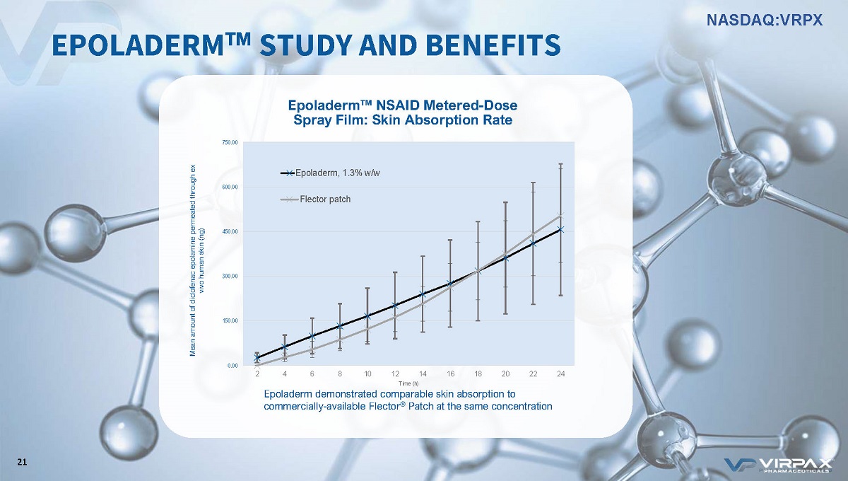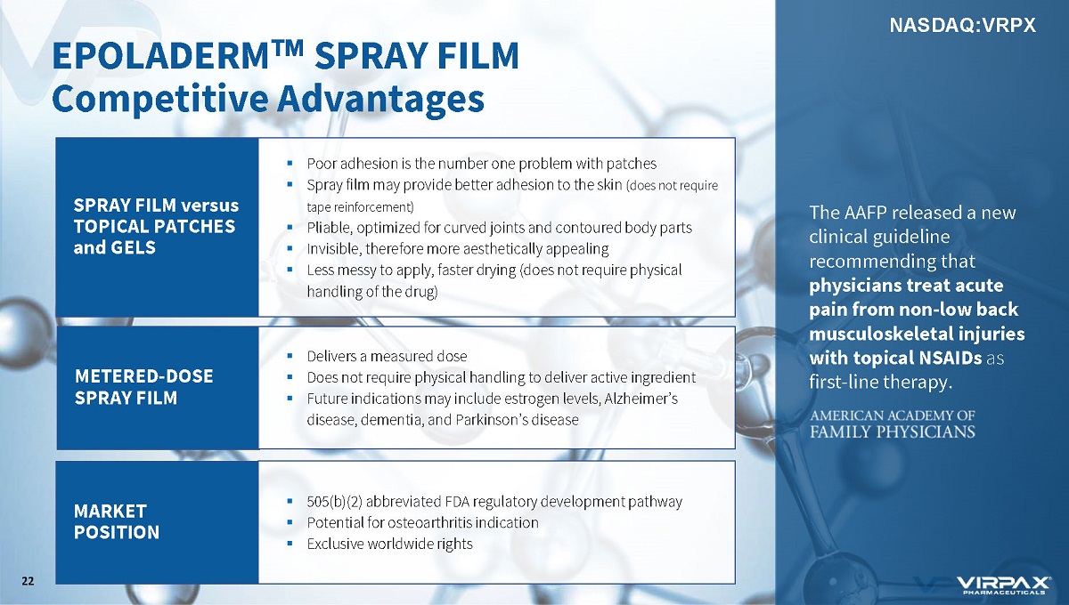 0.00 150.00 300.00 450.00 600.00 750.00 2 4 6 8 10 12 14 16 18 20 22 24 Mean amount of diclofenac epolamine permeated through ex vivo human skin (ng) Time (h) MS77, 1.3% w/w Flector patch Epoladerm, 1.3% w/w Epoladerm w NSAID Metered - Dose Spray Film: Skin Absorption Rate Epoladerm demonstrated comparable skin absorption to commercially - available Flector ® Patch at the same concentration EPOLADERM ҹ STUDY AND BENEFITS 21 NASDAQ:VRPX