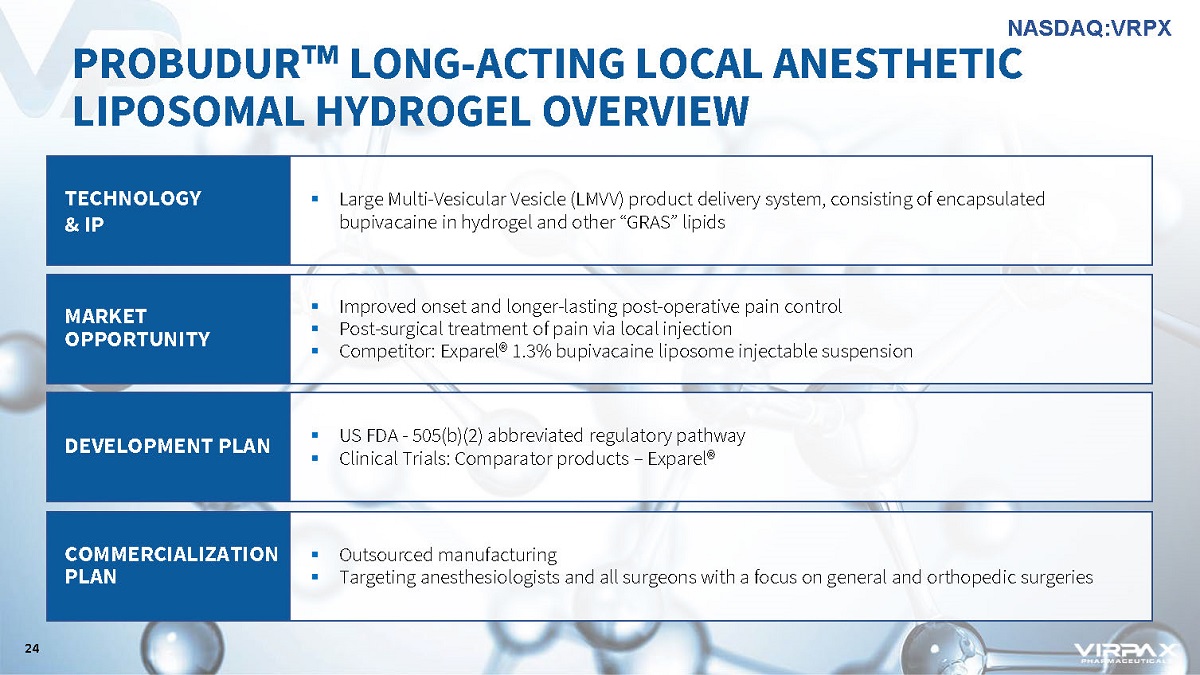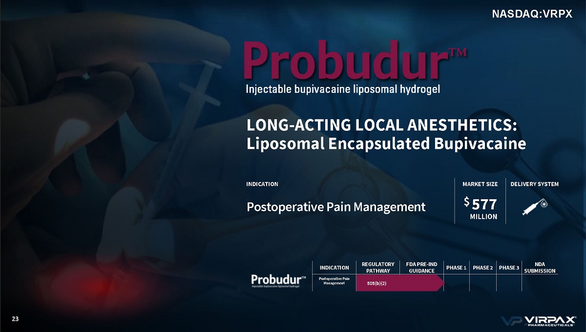 INDICATION MARKET SIZE DELIVERY SYSTEM Postoperative Pain Management $ 577 MILLION LONG - ACTING LOCAL ANESTHETICS: Liposomal Encapsulated Bupivacaine INDICATION REGULATORY PATHWAY FDA PRE - IND GUIDANCE PHASE 1 PHASE 2 PHASE 3 NDA SUBMISSION Postoperative Pain Management 505(b)(2) 23 NASDAQ:VRPX