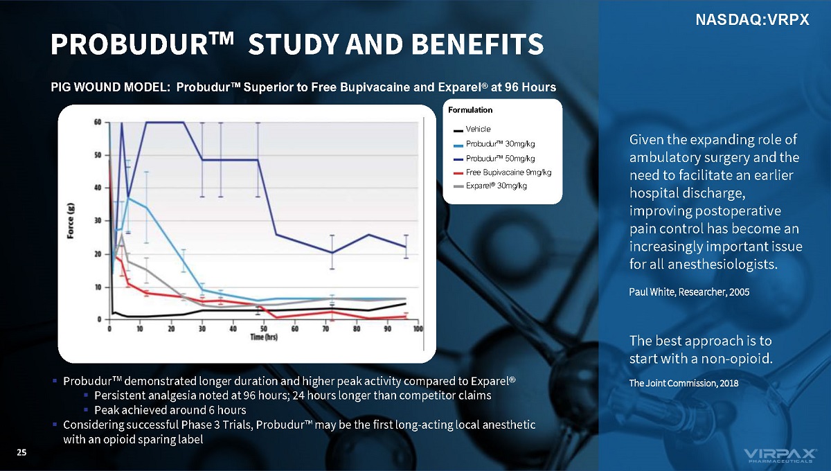 PROBUDUR ҹ LONG - ACTING LOCAL ANESTHETIC LIPOSOMAL HYDROGEL OVERVIEW TECHNOLOGY & IP ▪ Large Multi - Vesicular Vesicle (LMVV) product delivery system, consisting of encapsulated bupivacaine in hydrogel and other “GRAS” lipids MARKET OPPORTUNITY ▪ Improved onset and longer - lasting post - operative pain control ▪ Post - surgical treatment of pain via local injection ▪ Competitor: Exparel® 1.3% bupivacaine liposome injectable suspension DEVELOPMENT PLAN ▪ US FDA - 505(b)(2) abbreviated regulatory pathway ▪ Clinical Trials: Comparator products – Exparel® COMMERCIALIZATION PLAN ▪ Outsourced manufacturing ▪ Targeting anesthesiologists and all surgeons with a focus on general and orthopedic surgeries 24 NASDAQ:VRPX