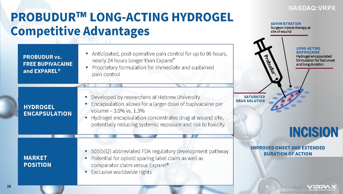 PIG WOUND MODEL: Probudur w Superior to Free Bupivacaine and Exparel ® at 96 Hours Formulation Vehicle Probudur w 30mg/kg Probudur w 50mg/kg Free Bupivacaine 9mg/kg Exparel ® 30mg/kg ▪ Probudur ҹ demonstrated longer duration and higher peak activity compared to Exparel ® ▪ Persistent analgesia noted at 96 hours; 24 hours longer than competitor claims ▪ Peak achieved around 6 hours ▪ Considering successful Phase 3 Trials, Probudur ҹ may be the first long - acting local anesthetic with an opioid sparing label PROBUDUR w STUDY AND BENEFITS 25 Given the expanding role of ambulatory surgery and the need to facilitate an earlier hospital discharge, improving postoperative pain control has become an increasingly important issue for all anesthesiologists. Paul White, Researcher, 2005 The best approach is to start with a non - opioid. The Joint Commission, 2018 NASDAQ:VRPX
