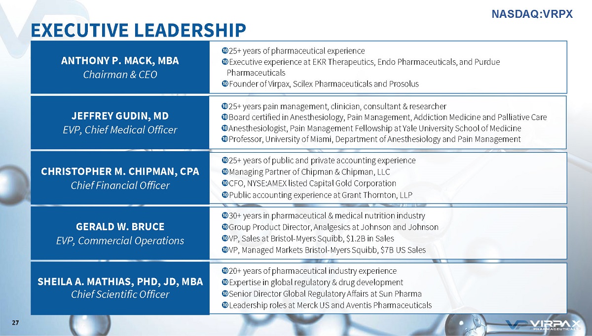 PROBUDUR vs. FREE BUPIVACAINE and EXPAREL® HYDROGEL ENCAPSULATION MARKET POSITION ▪ Anticipated, post - operative pain control for up to 96 hours, nearly 24 hours longer than Exparel ® ▪ Proprietary formulation for immediate and sustained pain control ▪ Developed by researchers at Hebrew University ▪ Encapsulation allows for a larger dose of bupivacaine per volume – 3.0% vs. 1.3% ▪ Hydrogel encapsulation concentrates drug at wound site, potentially reducing systemic exposure and risk to toxicity. ▪ 505(b)(2) abbreviated FDA regulatory development pathway ▪ Potential for opioid sparing label claim as well as comparator claim versus Exparel® ▪ Exclusive worldwide rights PROBUDUR w LONG - ACTING HYDROGEL Competitive Advantages 26 ADMINISTRATION Surgeon injects therapy at site of wound INCISION IMPROVED ONSET AND EXTENDED DURATION OF ACTION SATURATED DRUG SOLUTION LONG - ACTING BUPIVACAINE Hydrogel encapsulated formulation for fast onset and long duration NASDAQ:VRPX