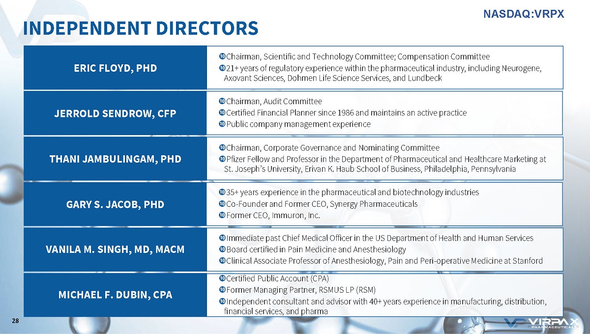 EXECUTIVE LEADERSHIP 27 NASDAQ:VRPX ▪ 25+ years of pharmaceutical experience ▪ Executive experience at EKR Therapeutics, Endo Pharmaceuticals, and Purdue Pharmaceuticals ▪ Founder of Virpax, Scilex Pharmaceuticals and Prosolus ANTHONY P. MACK, MBA Chairman & CEO ▪ 25+ years pain management, clinician, consultant & researcher ▪ Board certified in Anesthesiology, Pain Management, Addiction Medicine and Palliative Care ▪ Anesthesiologist, Pain Management Fellowship at Yale University School of Medicine ▪ Professor, University of Miami, Department of Anesthesiology and Pain Management JEFFREY GUDIN, MD EVP, Chief Medical Officer ▪ 25+ years of public and private accounting experience ▪ Managing Partner of Chipman & Chipman, LLC ▪ CFO, NYSE:AMEX listed Capital Gold Corporation ▪ Public accounting experience at Grant Thornton, LLP CHRISTOPHER M. CHIPMAN, CPA Chief Financial Officer ▪ 30+ years in pharmaceutical & medical nutrition industry ▪ Group Product Director, Analgesics at Johnson and Johnson ▪ VP, Sales at Bristol - Myers Squibb, $1.2B in Sales ▪ VP, Managed Markets Bristol - Myers Squibb, $7B US Sales GERALD W. BRUCE EVP, Commercial Operations ▪ 20+ years of pharmaceutical industry experience ▪ Expertise in global regulatory & drug development ▪ Senior Director Global Regulatory Affairs at Sun Pharma ▪ Leadership roles at Merck US and Aventis Pharmaceuticals SHEILA A. MATHIAS, PHD, JD, MBA Chief Scientific Officer