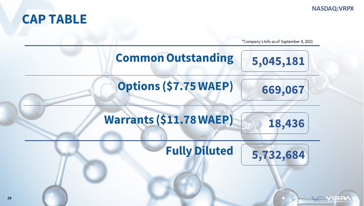 INDEPENDENT DIRECTORS 28 NASDAQ:VRPX ▪ Chairman, Scientific and Technology Committee; Compensation Committee ▪ 21+ years of regulatory experience within the pharmaceutical industry, including Neurogene, Axovant Sciences, Dohmen Life Science Services, and Lundbeck ERIC FLOYD, PHD ▪ Chairman, Audit Committee ▪ Certified Financial Planner since 1986 and maintains an active practice ▪ Public company management experience JERROLD SENDROW, CFP ▪ Chairman, Corporate Governance and Nominating Committee ▪ Pfizer Fellow and Professor in the Department of Pharmaceutical and Healthcare Marketing at St. Joseph’s University, Erivan K. Haub School of Business, Philadelphia, Pennsylvania THANI JAMBULINGAM, PHD ▪ 35+ years experience in the pharmaceutical and biotechnology industries ▪ Co - Founder and Former CEO, Synergy Pharmaceuticals ▪ Former CEO, Immuron, Inc. GARY S. JACOB, PHD ▪ Immediate past Chief Medical Officer in the US Department of Health and Human Services ▪ Board certified in Pain Medicine and Anesthesiology ▪ Clinical Associate Professor of Anesthesiology, Pain and Peri - operative Medicine at Stanford VANILA M. SINGH, MD, MACM ▪ Certified Public Account (CPA) ▪ Former Managing Partner, RSMUS LP (RSM) ▪ Independent consultant and advisor with 40+ years experience in manufacturing, distribution, financial services, and pharma MICHAEL F. DUBIN, CPA