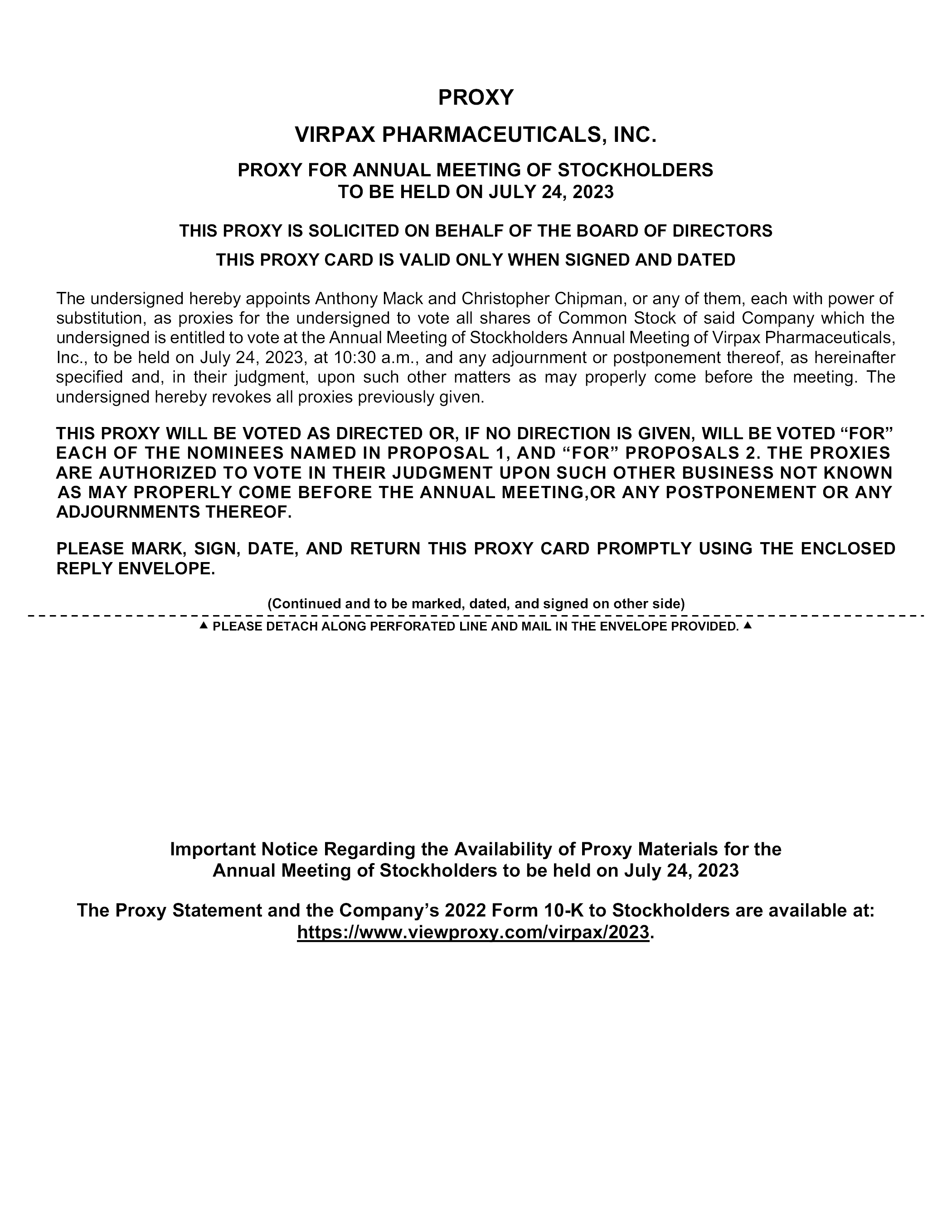 PROXY VIRPAX PHARMACEUTICALS, INC. PROXY FOR ANNUAL MEETING OF STOCKHOLDERS TO BE HELD ON JULY 24, 2023 THIS PROXY IS SOLICITED ON BEHALF OF THE BOARD OF DIRECTORS THIS PROXY CARD IS VALID ONLY WHEN SIGNED AND DATED The undersigned hereby appoints Anthony Mack and Christopher Chipman, or any of them, each with power of substitution, as proxies for the undersigned to vote all shares of Common Stock of said Company which the undersigned is entitled to vote at the Annual Meeting of Stockholders Annual Meeting of Virpax Pharmaceuticals, Inc., to be held on July 24, 2023, at 10:30 a.m., and any adjournment or postponement thereof, as hereinafter specified and, in their judgment, upon such other matters as may properly come before the meeting. The undersigned hereby revokes all proxies previously given. THIS PROXY WILL BE VOTED AS DIRECTED OR, IF NO DIRECTION IS GIVEN, WILL BE VOTED “FOR” EACH OF THE NOMINEES NAMED IN PROPOSAL 1, AND “FOR” PROPOSALS 2. THE PROXIES ARE AUTHORIZED TO VOTE IN THEIR JUDGMENT UPON SUCH OTHER BUSINESS NOT KNOWN AS MAY PROPERLY COME BEFORE THE ANNUAL MEETING, OR ANY POSTPONEMENT OR ANY AD- JOURNMENTS THEREOF. PLEASE MARK, SIGN, DATE, AND RETURN THIS PROXY CARD PROMPTLY USING THE ENCLOSED REPLY ENVELOPE. (Continued and to be marked, dated, and signed on other side) PLEASE DETACH ALONG PERFORATED LINE AND MAIL IN THE ENVELOPE PROVIDED. Important Notice Regarding the Availability of Proxy Materials for the Annual Meeting of Stockholders to be held on July 24, 2023 The Proxy Statement and the Company’s 2022 Form 10-K to Stockholders are available at: https://www.viewproxy.com/virpax/2023.