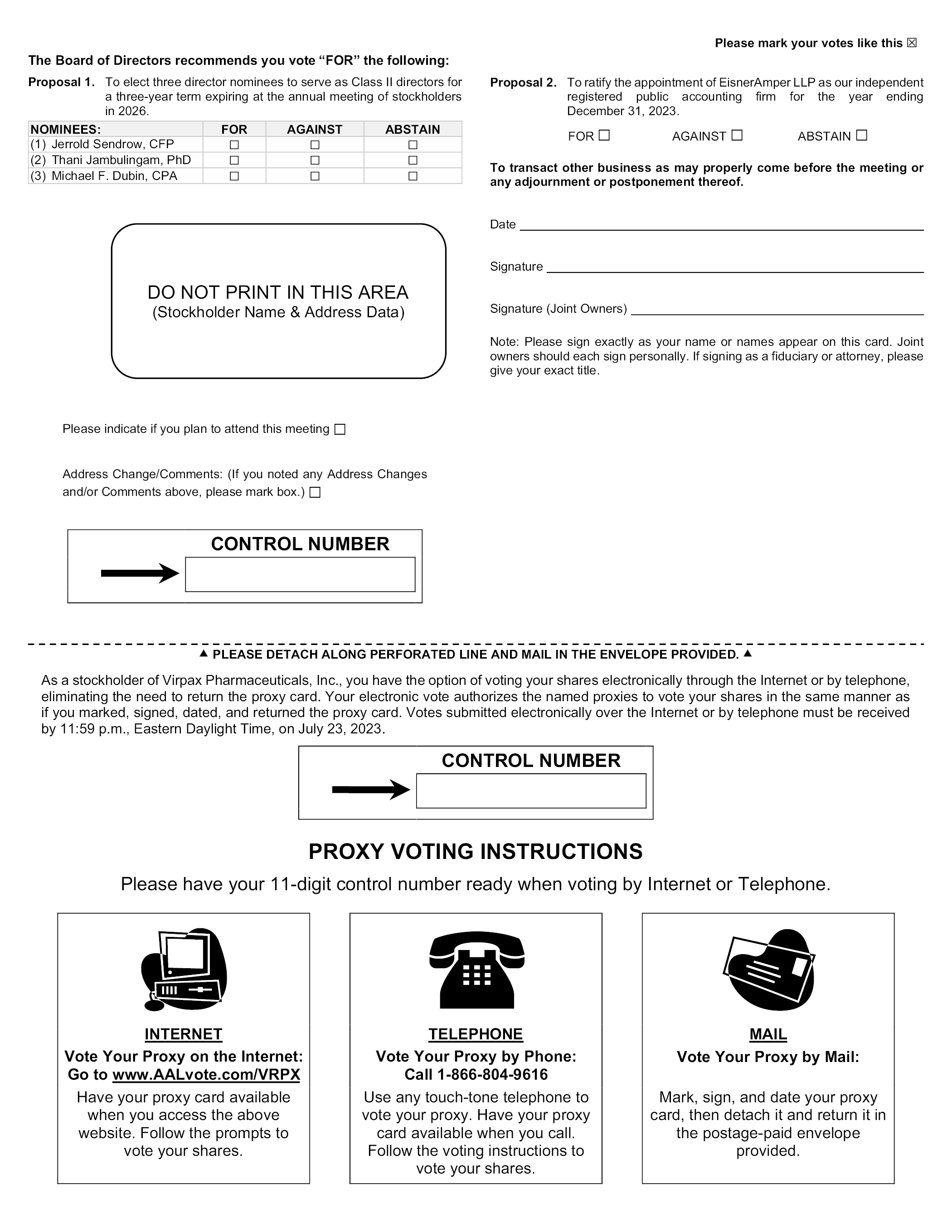 The Board of Directors recommends you vote “FOR” the following: Proposal 1. To elect three director nominees to serve as Class II directors for a three-year term expiring at the annual meeting of stockholders in 2026. NOMINEES: FOR AGAINST ABSTAIN (1) Jerrold Sendrow, CFP (2) Thani Jambulingam, PhD (3) Michael F. Dubin, CPA DO NOT PRINT IN THIS AREA (Stockholder Name & Address Data) Please indicate if you plan to attend this meeting Address Change/Comments: (If you noted any Address Changes and/or Comments above, please mark box.) Please mark your votes like this Proposal 2. To ratify the appointment of EisnerAmper LLP as our independent registered public accounting firm for the year ending December 31, 2023. FOR AGAINST ABSTAIN To transact other business as may properly come before the meeting or any adjournment or postponement thereof. Date Signature Signature (Joint Owners) CONTROL NUMBER Note: Please sign exactly as your name or names appear on this card. Joint owners should each sign personally. If signing as a fiduciary or attorney, please give your exact title. PLEASE DETACH ALONG PERFORATED LINE AND MAIL IN THE ENVELOPE PROVIDED. As a stockholder of Virpax Pharmaceuticals, Inc., you have the option of voting your shares electronically through the Internet or by telephone, eliminating the need to return the proxy card. Your electronic vote authorizes the named proxies to vote your shares in the same manner as if you marked, signed, dated, and returned the proxy card. Votes submitted electronically over the Internet or by telephone must be received by 11:59 p.m., Eastern Daylight Time, on July 23, 2023. PROXY VOTING INSTRUCTIONS Please have your 11-digit control number ready when voting by Internet or Telephone. INTERNET TELEPHONE MAIL Vote Your Proxy on the Internet: Go to www.AALvote.com/VRPX Vote Your Proxy by Phone: Call 1-866-804-9616 Vote Your Proxy by Mail: Have your proxy card available when you access the above website. Follow the prompts to vote your shares. Use any touch-tone telephone to vote your proxy. Have your proxy card available when you call. Follow the voting instructions to vote your shares. Mark, sign, and date your proxy card, then detach it and return it in the postage-paid envelope provided.