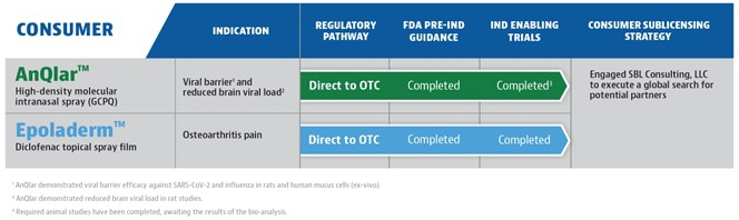 We have exclusive global rights to the following proprietary patented technologies: (i) Molecular Envelope Technology (“MET”) that uses an intranasal device to deliver enkephalin for the management of severe pain, including post cancer pain (Envelta™) and post-traumatic stress disorder (“PTSD”), (ii) Injectable “local anesthetic” Liposomal Technology for postoperative pain management (Probudur™), and (iii) Investigational formulation delivered via the nasal route to enhance pharmaceutical-grade cannabidiol (“CBD”) transport to the brain (“NobrXiol™”, formerly VRP324) to potentially treat epileptic seizures associated with Lennox-Gastaut syndrome (LGS) and Dravet syndrome (DS) in pediatric patients two years of age and older. We are also exploring value creative opportunities for our two nonprescription product candidates including seeking regulatory approval for commercialization of such products: AnQlar™, which is being developed as a 24-hour prophylactic viral barrier to inhibit viral infection by influenza or SARS-CoV-2, and Epoladerm™, which is a topical diclofenac epolamine metered dosed spray film formulation being developed to manage pain associated with osteoarthritis.