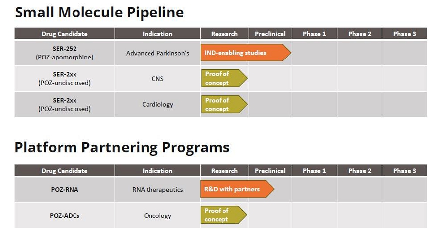 Our business is largely focused on the development of a wholly-owned pipeline of POZ-enabled drug candidates for CNS indications, including Parkinson’s disease. Our lead product candidate, SER 252 (POZ-apomorphine), is a POZ conjugate of the potent dopamine agonist apomorphine being developed for the treatment of Parkinson’s disease and is in preclinical development. SER 252 is designed to provide CDS via a subcutaneous injection delivered one to two times per week. CDS is a long-sought clinical strategy for Parkinson’s disease that currently approved therapies fall short of delivering. We intend to develop other potential applications of the POZ technology, such as therapeutics delivered through Antibody Drug Conjugates (‘ADCs and Lipid Nanoparticle (“LNP”) technology, through partnerships. Our SER 214, a POZ conjugate of rotigotine for the treatment of early Parkinson’s and Restless Leg Syndrome, was our first product candidate advanced into human study and has completed a Phase Ia study in 19 subjects. This product candidate served as a proof of principle for our POZ technology. This candidate is not being advanced internally. We intend to potentially out-license this product candidate. We have not received FDA approval for any of our product candidates and our lead product candidate remains in preclinical development.