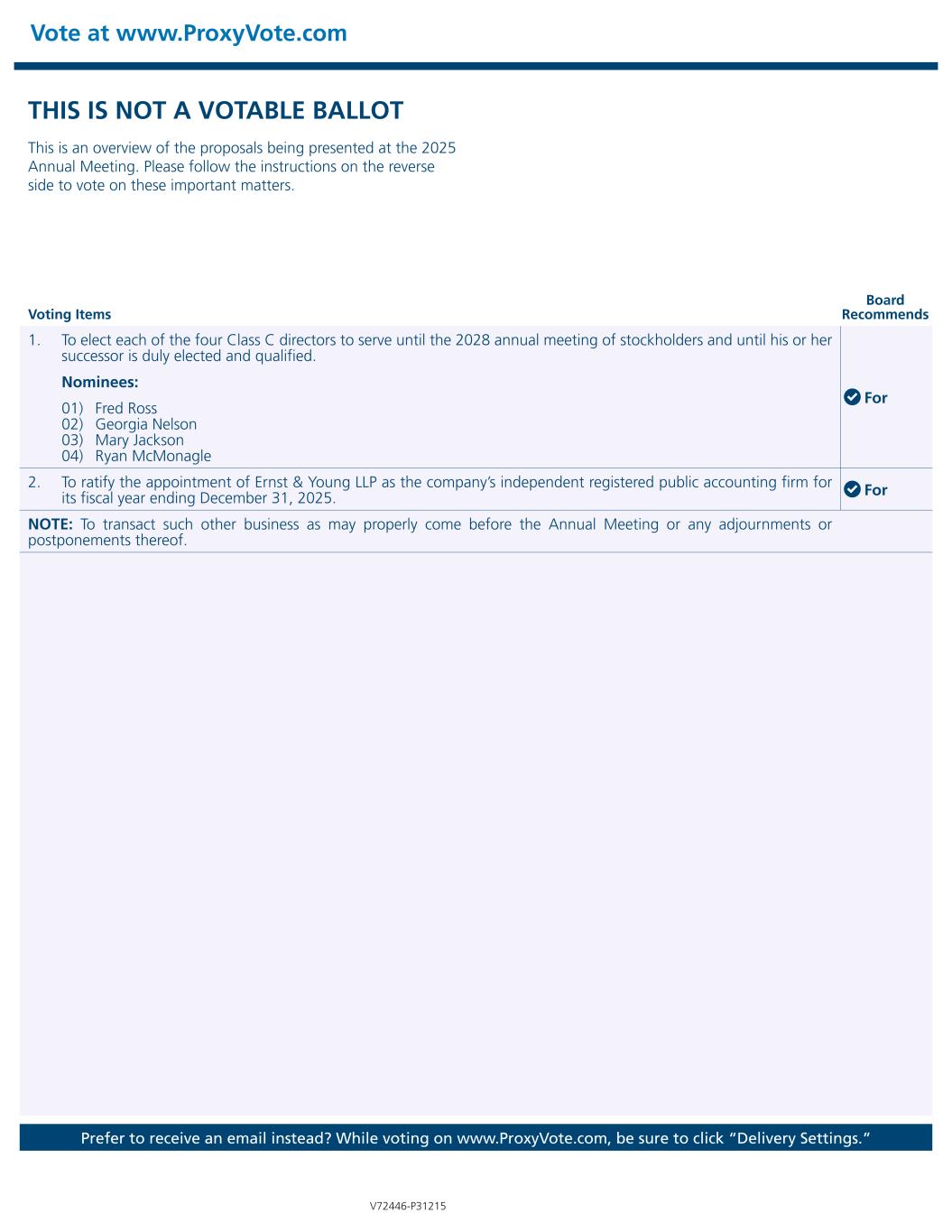 Vote at www.ProxyVote.com Prefer to receive an email instead? While voting on www.ProxyVote.com, be sure to click “Delivery Settings.” Voting Items Board Recommends V72446-P31215 THIS IS NOT A VOTABLE BALLOT This is an overview of the proposals being presented at the 2025 Annual Meeting. Please follow the instructions on the reverse side to vote on these important matters. 1. To elect each of the four Class C directors to serve until the 2028 annual meeting of stockholders and until his or her successor is duly elected and qualified. For Nominees: 01) Fred Ross 02) Georgia Nelson 03) Mary Jackson 04) Ryan McMonagle 2. To ratify the appointment of Ernst & Young LLP as the company’s independent registered public accounting firm for its fiscal year ending December 31, 2025. For NOTE: To transact such other business as may properly come before the Annual Meeting or any adjournments or postponements thereof.