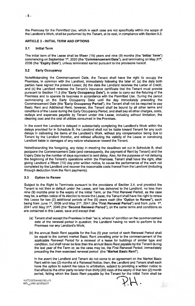 the Premises for the Pemitted Use, wtiiCh in each case are not speciflcally wlthln the scope of the Landbrd's Work, shall be perfomad by the Tenanl, at its cost, in compllance wlth Section 9.3. ARTICLE 3 - INITIAL TERM AND OPTIONS The initial term of the Lease shall be fiftean ( 15 ) years and nine ( 9 ) months (the "lciMal Term") commencing on September 1 “, 2020 (the "Commencement Date"), and tamlnating on Iday 31 ", 2036 (the "Explry Date"), unless teminated earlier pursuant to the provisions hereof . 3 J Early Occupancy Notwithstanding the Commencement Date . the Tenant shall have tha right to occupy the Premises . In common with the Landlord, immediately fobowing the later of : (a) the date both parties hava siqnad the present Lease ; (b) the date the Landlord racaives tha Lettar of Credit, and (c) the Landlord re‹»ivas Ihe Tenant's insurance certiñcate that lha Tenant must provide pursuant to Section 11 . 3 (the "Early Occupancy oata"), in order to carry out the fixturing of the Premises and to operate ita budness in accordance with the Pemlged Use . During the period commendng on the Early Occupancy Date until the day immediately precedlng the Commencement Dale (the "Early Occupancy Perlod"), the Tenant shall not be required lo pay Basic Rent and Adclitional Rent ; fowaver . Ihe Tenanl shall be bound by all ofher tems and condldons of the Lease during the Early Occupancy Period, and shall pay all other charges, costs . outlays and expenses payable by Tenant under Ihis Lease, including • /ithout limitation . Ihe cleaning cost and the cost of utittles consumed in tha Pramlses . In the event the Landlord is delayed In subslantially completing the Landlord‘s WorK withln lhe delays provldad for In Schadule B, the Landlord shan not be fiable toward Tenant fœ any such delays In dellvering the items of the Landk›rd's Work, without any compensation being due to Tanant by Ihe Landlord therefor, and without alTecting the valldity of the Leasa or construing Landlord liable in domages of any naluæ whatsoever toward the TenanL Notwithstanding the foragoing, any delay in meeting the deadlines set out in Oedule B, shaI| postpone the CoiTimencement Dele (and c‹x \ sequen 0 y, Iha payment of Rent by Tenant) and the Expiry Data by Ihe numbar of daya equivalent fo said delay . Also . for tha purposes of not delaying the beginning of the Tanent‘s operations within the Premises, Tenant shall have Iha rlght . after giving Landlord a fifteen ( 15 ) day pñor written notlce, to cause the performance of \ ha work not complatad by the Landlord and recover Iha reasonable costs thereof from the Landlord (lnduding IfiFOU 9 ^ d eductionfrom the Rent payments) . 3. Option to Renew Subjact to tha Rlght lo Teminata pursuant to tha provisions of Section 3 . 4 , and provided the Tenant is not then in default under the Leaae, and has dalivared Io the Landlord, no less Ihan nine ( 9 ) months prior to lhe expiry of the Initial Tann, or the Flrst Renewal Perlod, aa the case may be, a written notice of its election l o renew the Lease, the Teant shall have the right to renew this Lease for Mo ( 2 ) additlonal periods of five ( 5 ) years each (Ifia "Option to Renew“), each being from June 1 “, 2036 until May 31 ", 2041 (the "Flrat Renewal Period") and from June 1 ", 2041 until May 31 “, 2 D 46 (the "Second Ranawal Period"), on the same tems and condltJons as are contained in this Lease, save and except thet : (a) Tenant shall accept the Premises in their"as is, where is” condition on the commencement date of the renewal period in question ; the Landlord having no work to perfom to the Premises nor any Landlord's Work ; (b) the annual Basic Rent payable for the fiva (5) year oeriod of each Rwiewal Period shall be aquaJ to the current market Basic Rent prevelling prlor to the commencement of the applicable Ranewal Pariod for a renewal of a lease for buildlngs of similar typa and diUon. but shall never be less Ihan the annual Basic Rent payable by the Tenant during Ihe last yaar of the Tern or, as the casa may be, the Firat Renewal Period, immediately preceding the thon exercised renewal period (the “MarKet Baelc Rent") . In Ihe event the Landlord and Tenant do not come to an agreement on Ihe Markat Basic Rent within Mo ( 2 ) months of a Ranewal Notice, then, 0 æ Landlord and Tenant shall each hava the option to submlt Ihe issue to arbiltaüon, su@|ect to provldlng a writtan notiœ to that ePed io the other party no later than fhlrty( 3 D) days of Ifie axplry of \ hat two ( 2 ) monlh period, Mailing which the Basic Rent payable by tha Tanant for the Ini#aI Tem shall be