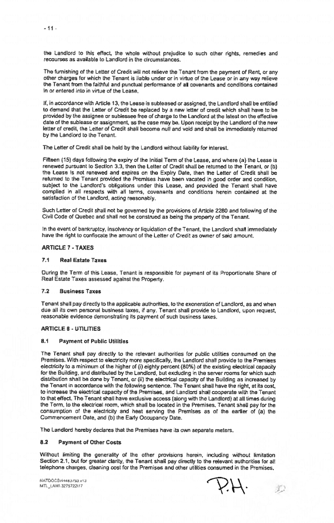 - 11 Ihe Landlord to this effacL lhe whole without prejudice lo such other rights, ramedies and recourses as available to Landlcrd in ltie circumstances . The furnishing of the Letter of Credit will not relieve the Tanant from the peyment of Rent or any othar chargaa for which the Tenant is liable under or in virtue of tha Lease or in any wey relieve tha Tanam from the faithful and punctual performance of al covenants and condltions comainad In or anterad inlo in vinue of the Lease . If, in accordance wilh Artlde 13 , the Leasa is subleased or assigned . the Landlord shall be unfilled to damand that the Latter of Credit be replacad by a new leder of credit which shall have to ba provided by the agsignea or sublessee free of charge to tha Landlord at the latest on the affedive dateolWesubleaseorasbgMmeMt x e wsemaybiUponreceip(byihe Landbdo(Wenew letter of crediL tha Leher of Credit shall becoma null and void and shall be immediately returned by Ihe Landlord la the Tanant . The Laher of Gredif shall be fraid by the Landlord without liability for interest . Figeen ( 15 ) days following the expiry of the Initial Tern of the Lease, and where (a) lhe Laase is renewed pursuant lo Sedlon 3 . 3 , then tha Letter of Credit shall be returned to Itie Tenanl, or (b) the Leasa Is not renewed and explras on the Explry Date, lhen the Letter of Credit shall be returned to the Tanant provided the Premlsas hava baen vacated in go ¢ <l order and condition . subject to the Landlord's obligalians under this Lease, and provided Ifie Tenant shall have complied in all respects with all terms, covenants and conditions herein contained at the satisfaction of the Landlord, acting reasonably . Such Letler of Gredit shall not be governed by the provisions of Anlcle 2280 and following of the Civil Code of Quebec and shall not be construed as being the propeny of tha Tenant . In the event of bankruptcy . insolvency or liquidation of the Tenant . Ihe Landlord shag immediately have lhe right lo confiscate the amount of the Letter of Credit as owner of said amount . ARTICLE 7 - TMES 7.I Raal Estate Taxes Ouring Ihe Term of this Leasa . Tenant is responsible for paymanl of its Proportionate Share d Real Es 1 ate Taxes assessed againsl the Property . 7.2 Business Taxea Tenant shall pay directly to tha applicable authorities . Io the exoneration of Landlord, as and when due all its own personal business laxes . if any . Tenant shall provide lo Landbrd, upon request reasonable evidence demonstrating frs payment of such business laxes . ARTICLE 8 - UTILITIES 1. Payment of Public Lltillflas The Tenant shaH pay directly to Itie relevant aulhorifies for public utilities consumed on the Premises . With respect to alectrlcity more specifically . Ihe Landlord shalt provide to lha Premises electricity to a minimum of the higher of (i) eighty percent ( 80 ƒ A) of the existing electrical ¢ apacily for the Building . and distributed by the Landlord, bul exdudlng in Ihe servar rooms for which such distribution shall ba done by Tenant . or (ii) the electrical capacity of the Buildlng as incraased by the Tenant in accordance with the following sen \ enc@ . The Tenant shall have the right, at its casL to inaeeea the electrical capacity of the Premises, and Landlord shdl cooperate wllh the Tenant to Ihat effect . The Tenant shall have exdusive access (dong with the Landlord) at all times duñng the Term . ie the electrical room, whiCh shall be located in the Premises . Tenant shall pay for lhe consumption of the electricity and heat sewing the Pramlsas as of Ihe ea/fler of (a) the Commencement Oaie, and (b) lhe Early Occupancy Date . The Landlord hereby declarer that Cha Premises heve its own separate meters . 2. Payment of Other Costs W i thou t limiting Ihe gen e rality of Iha ot h er provisions h erein, including without limilation Section 2 . 1 , but for greater clarity, the Tenant shall pay directly to the relevant aulhoritiee for all telephona charges, daaning cosl for the Premises and dher utilities consumed in the Premises .