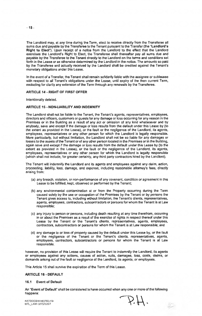 1B - The Landlord may, at any time durlng the Term, elect to receive directly from the Transferee all sums dua and payable by the Transferee to the Tenant pumuent to the Transfer (the "Landlord's Right to EleO“) . Upen receipt of a nogce from the Landlord to the effect Ihat the Landbrd exercises the Landlord's Right to Elect, the Transferee shall thereafter pay all sums due and payable by the Transferee Io the Tenent dlrectly to the Landlord on the terms and conditions set forth in lhe Lease or as otherwise detemined by lhe Landlord in the notice . The amounts so paid by the Transferee and actually received by the Landlord shah be credited against the Tenant's monetary obligations under thls Lease . In the evenl of a Transfer, the Tenant shall remain solldarily liable with the assignee or sublessae wilh resped to all Tenant's obligations under the Lease, until expiry of the then current Tern, exdudlng for clarity any extension of Ihe Term through any renewals by the Transferee . ARTICLE 14 - RIGHT QF FIRST OFFER Inlentionally deletad . ARTICLE 15 • NON - MABILITY AND INDEMNITY The Landlord shell not be liable to the Tenant, the Tenanl's agents, representatives, employaes, directors and officers, customers or guasls for any damage or loss occurring for any reason in the Premises or in the Building as a result of any acl or omission of any kind whalsoaver and by anybody, save and except if the damage or loss results from the default under this Lease by (to lhe axtanf as provided in the Lease), or the fault or the negligence of lhe Landlord, ils agents, employees, represanta \ ives or any other person for which the Landlord Is legally responsible . More panicularly, bul without limitation, \ he Landlord shall nd be so liable for any damages or losses to the assets of the Tenant or of any olher parson located in the Premises or in the Building, again save and except if the damage or loss results from the defaull under this Lease by (to the extent as provided in the Lease) . or the fault or the negligence of the Landbrd . its agents, employaes, repraaentatives or any other parson for which the Landlord Is legally responsible (which shall not include, for greater certainty, any third party contractors hired by Ihe Landlord) . The Tenant will indemnify Ihe Landlord and its agents and employaas against any claim, adion, Proceeding, liability, loss, damage . and expense, indudlng reasonable atlaney's fees, directly arising from : (a) any breach . violalion . or non - perfomanre of any covenant . condition or agreement in this Lease lo be fulfilled, kapL observed or perfomed by Ihe Tenant ; (b) any environmental comamination at or from the Property occurring during the Tern caused solely by the use or occupation of the Premises by the Tenant or by persons the Tenant givn access to, indudlng without limitation, the Tenant's dients . represenlalives, agents, employees, contractors . subcontraaors or persons for whom the Tenant is at Law responsible ; (c) any injury to person or persons, including death resuming at any time therefrom, occurring in or about the Premises as a result of the exercise of rights in respect thereof under this Lease by ihe Tenant or the Tenant's events, representatives, agents . employees . confiaetora, subcontractors re persons for whom the Tenant ig at Law responsible ; and (d) any damage Io or bss of property caused by the default under this Lease by, or the faull or the negligance of lhe Tenant or the Tenanl's clients, raprasentatives . agents, employees, contradors, subcontractors or persons for whom the Tenant is at Law rasponsible . however . no provision of this Lease wgl requira the Tenant lo indemnify the Landbrd, its agents or amployees agalnsł any actlons, causes of actlon, suits, damagas, loss, costs, daims, or demands ańsing out of lhe fauk or negligence of tha Landlord, its agents, or employees . This Articla 15 shall gurvive the oxpiratiDn of the Term of lhis Lease . ARTICLE 18 - DEFAULT 16.1 Event of Default An "Event of Defaulf' shall be considered to have occurred when any one or more of the following happens : NATDOM‹*0ń90v13
