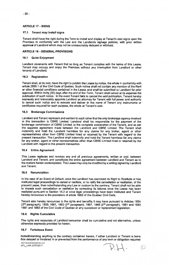 47.1 Tenant may install algns Tenant shall have the right during the Tern to install and display at Tenant's cost siqns upon the Premiss in confomity wilh \ he Law and the Landlords signage policiœ, with prior wriłlen approve of Landlord which may not be unreasonably delayed or withheld . ARTICLE 18 - GENERAk PROVISIONS IB . 1 Quiet Enjoyment Landlard œvønants with Tenant that so long as Tenant empties wilh the tœms of this Lease, Tenanl may occupy and enjoy the Premisas withoul any interruption from Landlord or other tenanN of Landlord . Tenant shall . at its cost . hBve the right to pubfsh tłæ Lease by notice, Ihe wfiole in œnfomity wilh article 2999 1 of the C/vi/ Code of Qučôec . Such notlce shall not contain any menlJon of the Rent a other financial condltions contained in the Laese and shah be oubmihed l o Landlord fnr prtor approval . Within thirty ( 30 ) days after the end of the Term, Tenant shat cancel at its expense the publkation of such nofice . In the event Tenant fms to cancel the said publicaôon, Tenant hereby expæssly and irravocably appoinls Landlord as attorney for Tenant with full powar and authority to œncal such ndlce and to executa and deliver in the nama of Tenant any instruments or certiflcalas required for such purpose, Iha whole at Tenant's cost . fi 8 . 3 Brołceraga Commissions Landłozl and Tenant represent and warrant to each olher that the only brokeæge agency involved in thls transaction is CBRE Limited . Landlord shall be responsible for the payment of the brokerage œmmission of CBRE Limited, to the complete exœaration of the Tenant and as per the sepaæta agreement made between the Landlord and CBRE Limitad . The Tenant shall indemnify end hold Ihe Landlord harmlaae for any ctaimg for any broker, agenî or other represenlatives olher than CBRE Limlted hired or retained by the Tenanl wilh regard to the present transaction . The Landlord shall indemnify and hold the Tenant hamless far any claims for any broker, agent or other æpresentadves other than CBRE Limited hired or retalned by the Landlord with regard io the present transactlon . 4. Entire Agreement This Łaase replaces and revokes any and all pævious agreernanłs, written or oral, baMeen Landlord and Tanant, and constitutes tha entlre agreement between Løndkxd and Tenant æ to the matters herein contemplated . This Leacø may only be m ¢ <lIfied by a wriông signed by Landlord and TenanL 5. Renunciation In the case of ari Event of Default, once the Landlord has exercised its Right to Resiiata or has insôtuled legal proceeÒngs to cancel or reslllate . or to ratify tfe cancellaüon or res ¥ latla, of the present Leasa, than notwilhslanding any Law or custom to the contrary, Tenent shall not be able to impede such canœllaôon or msÆiation by œrrecbng ils faikires onœ the Lease has been resiliated pursuant to Section 16 . 2 or once legal proceedings have been instituted and Tenant hereby renounces to the provisions of arúcle 1883 of the Quebec Civil Code . Tenant alsa hereby renounces to the rights and benefits it may have pursuant to Articles 1854 ( 2 '* paragraph), 1859 , 1861 . 1863 ( 2 ^ paragraph), 18 G 7 , 1 B 68 ( 2 "* paragæph), 188 \ end 1883 1881 and 1883 of the Civil Code of Quebec or any successor or æplacement legislation . 6. Righta Cumulative The righD and reœursæ of Landlord hereunder shall be cumulaüva and nol alternative, unless othenvlse expressly provided for herain . 7. Fortuitous Event Notwithstanding anything to the conbary œntained herein, if eilher Landlord or Tenant is bona e a hyndared in or prevanted from the perfomænce of any tern or obllgaôon required