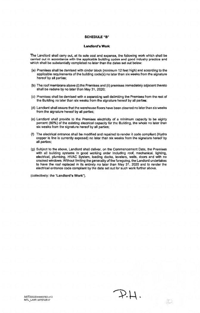 9CHEDULE "B" The Landlord shall carry out, at Its sole cogt and expense, tha fdlowlng work which shall ba carrled out in accordance with lhe applicable buildlng codas aml god indue!ry practice and which shah ba substantially completed no btar than Iha dates eat out bebw : Premises shall be dammed wlth cinder block (minimum 12 feat high) and according la the applicable requirements of Ihe building coda(s) no lalar then six weeks from tha signature hereof by a 4 parties ; (b) The roof membane above (I) tha PremBes and (ii) premises immadiataly edjacant lhareto shall öe redone by no later chan May 31, 2020: (c) Pramises shall be demlsed with e seperaling wall dalimiling tha Pramiaas from the rest of tha BuiDlng no laler than eix waelcs from the sfgnature hereof by âll parties: (d) Landkxd shall assure that the warehouse floors have been cleaned no later than six weeka (e Landlord shall provide to the Premises electricity of a mlnimum capacity to be eighty percent ( 803 t) of the exlatlrig elecoicel capacity for the Building, the whole no later Ihan six weekg from the signature heraof by all parties ; The eIec \ ricaI entranoe shall be modified and repaired to render it code comp ¥ ant (Hydro copper is line Is currently exposed) no late than six weeka from Ifie signature hereof by Subject to the above . Laridlord shall denver, on the Cornmenœment Oate, lhe Premises with all building systems In good working œder Includlng roof, madænkal, lighông, electrical, plumblng, HVAC SyEtem, loeding docKs, levelars, walb, doois and with no oacked windows . Without llmNng the generallty oftha foragoing . the Landlord undertakœ lo have the roof repleced in its entirety no later Ihan May 31 , 2020 and to ænder the elactrical enlrance code compllant by the date œt out for such work funher above . ectlval . the "Landlord's Wozk'