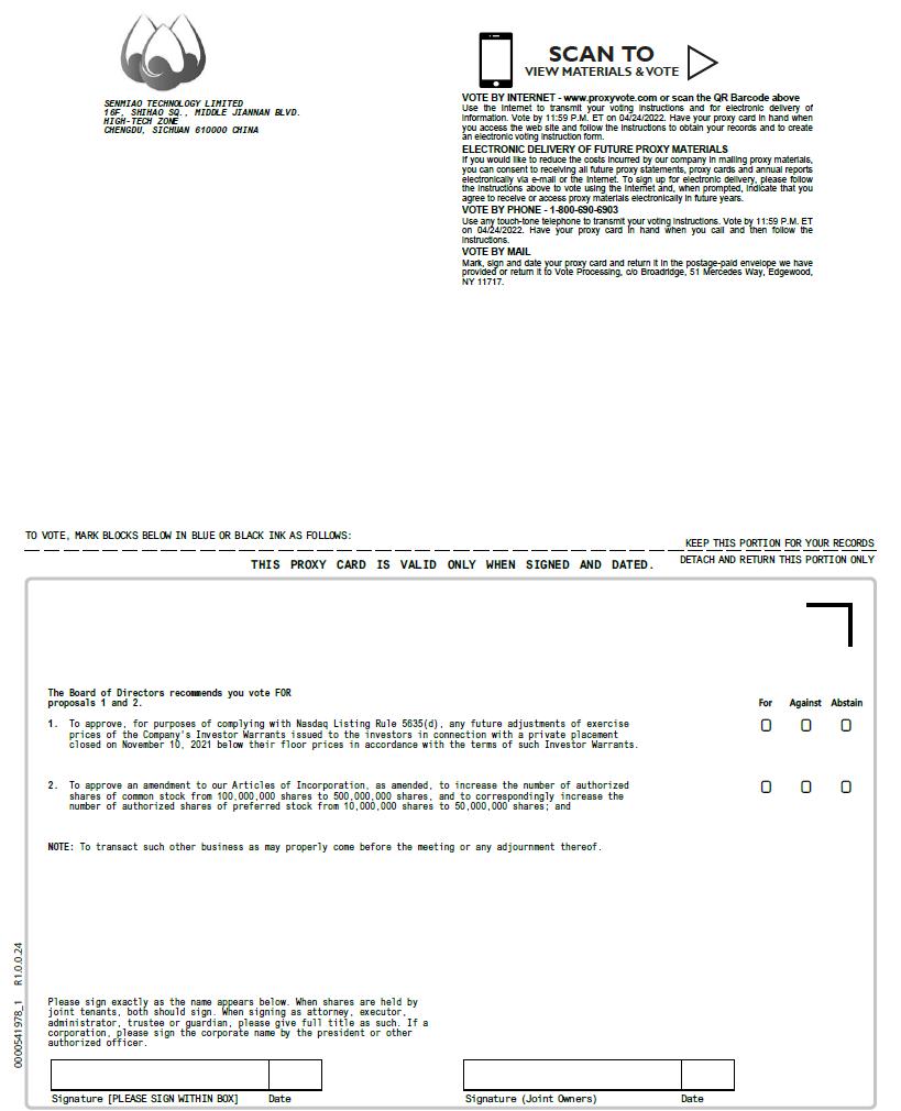 THIS PROXY CARD IS VALID ONLY WHEN SIGNED AND DATED. KEEP THIS PORTION FOR YOUR RECORDS DETACH AND RETURN THIS PORTION ONLY TO VOTE, MARK BLOCKS BELOW IN BLUE OR BLACK INK AS FOLLOWS: Signature [PLEASE SIGN WITHIN BOX] Date Signature (Joint Owners) Date SCAN TO VIEW MATERIALS & VOTE 0 0 0 0 0 0 0000541978_1 R1.0.0.24 SENMIAO TECHNOLOGY LIMITED 16F, SHIHAO SQ., MIDDLE JIANNAN BLVD. HIGH-TECH ZONE CHENGDU, SICHUAN 610000 CHINA VOTE BY INTERNET - www.proxyvote.com or scan the QR Barcode above Use the Internet to transmit your voting instructions and for electronic delivery of information. Vote by 11:59 P.M. ET on 04/24/2022. Have your proxy card in hand when you access the web site and follow the instructions to obtain your records and to create an electronic voting instruction form. ELECTRONIC DELIVERY OF FUTURE PROXY MATERIALS If you would like to reduce the costs incurred by our company in mailing proxy materials, you can consent to receiving all future proxy statements, proxy cards and annual reports electronically via e-mail or the Internet. To sign up for electronic delivery, please follow the instructions above to vote using the Internet and, when prompted, indicate that you agree to receive or access proxy materials electronically in future years. VOTE BY PHONE - 1-800-690-6903 Use any touch-tone telephone to transmit your voting instructions. Vote by 11:59 P.M. ET on 04/24/2022. Have your proxy card in hand when you call and then follow the instructions. VOTE BY MAIL Mark, sign and date your proxy card and return it in the postage-paid envelope we have provided or return it to Vote Processing, c/o Broadridge, 51 Mercedes Way, Edgewood, NY 11717. The Board of Directors recommends you vote FOR proposals 1 and 2. For Against Abstain 1. To approve, for purposes of complying with Nasdaq Listing Rule 5635(d), any future adjustments of exercise prices of the Company's Investor Warrants issued to the investors in connection with a private placement closed on November 10, 2021 below their floor prices in accordance with the terms of such Investor Warrants. 2. To approve an amendment to our Articles of Incorporation, as amended, to increase the number of authorized shares of common stock from 100,000,000 shares to 500,000,000 shares, and to correspondingly increase the number of authorized shares of preferred stock from 10,000,000 shares to 50,000,000 shares; and NOTE: To transact such other business as may properly come before the meeting or any adjournment thereof. Please sign exactly as the name appears below. When shares are held by joint tenants, both should sign. When signing as attorney, executor, administrator, trustee or guardian, please give full title as such. If a corporation, please sign the corporate name by the president or other authorized officer.