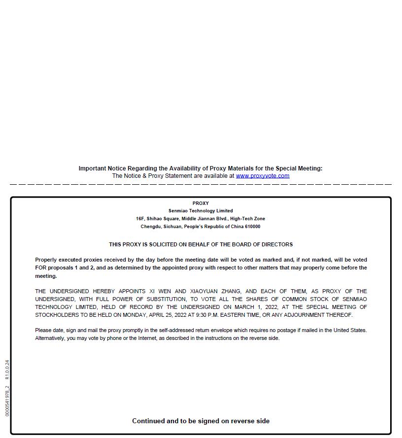 0000541978_2 R1.0.0.24 Important Notice Regarding the Availability of Proxy Materials for the Special Meeting: The Notice & Proxy Statement are available at www.proxyvote.com PROXY Senmiao Technology Limited 16F, Shihao Square, Middle Jiannan Blvd., High-Tech Zone Chengdu, Sichuan, People’s Republic of China 610000 THIS PROXY IS SOLICITED ON BEHALF OF THE BOARD OF DIRECTORS Properly executed proxies received by the day before the meeting date will be voted as marked and, if not marked, will be voted FOR proposals 1 and 2, and as determined by the appointed proxy with respect to other matters that may properly come before the meeting. THE UNDERSIGNED HEREBY APPOINTS XI WEN AND XIAOYUAN ZHANG, AND EACH OF THEM, AS PROXY OF THE UNDERSIGNED, WITH FULL POWER OF SUBSTITUTION, TO VOTE ALL THE SHARES OF COMMON STOCK OF SENMIAO TECHNOLOGY LIMITED, HELD OF RECORD BY THE UNDERSIGNED ON MARCH 1, 2022, AT THE SPECIAL MEETING OF STOCKHOLDERS TO BE HELD ON MONDAY, APRIL 25, 2022 AT 9:30 P.M. EASTERN TIME, OR ANY ADJOURNMENT THEREOF. Please date, sign and mail the proxy promptly in the self-addressed return envelope which requires no postage if mailed in the United States. Alternatively, you may vote by phone or the Internet, as described in the instructions on the reverse side. Continued and to be signed on reverse side