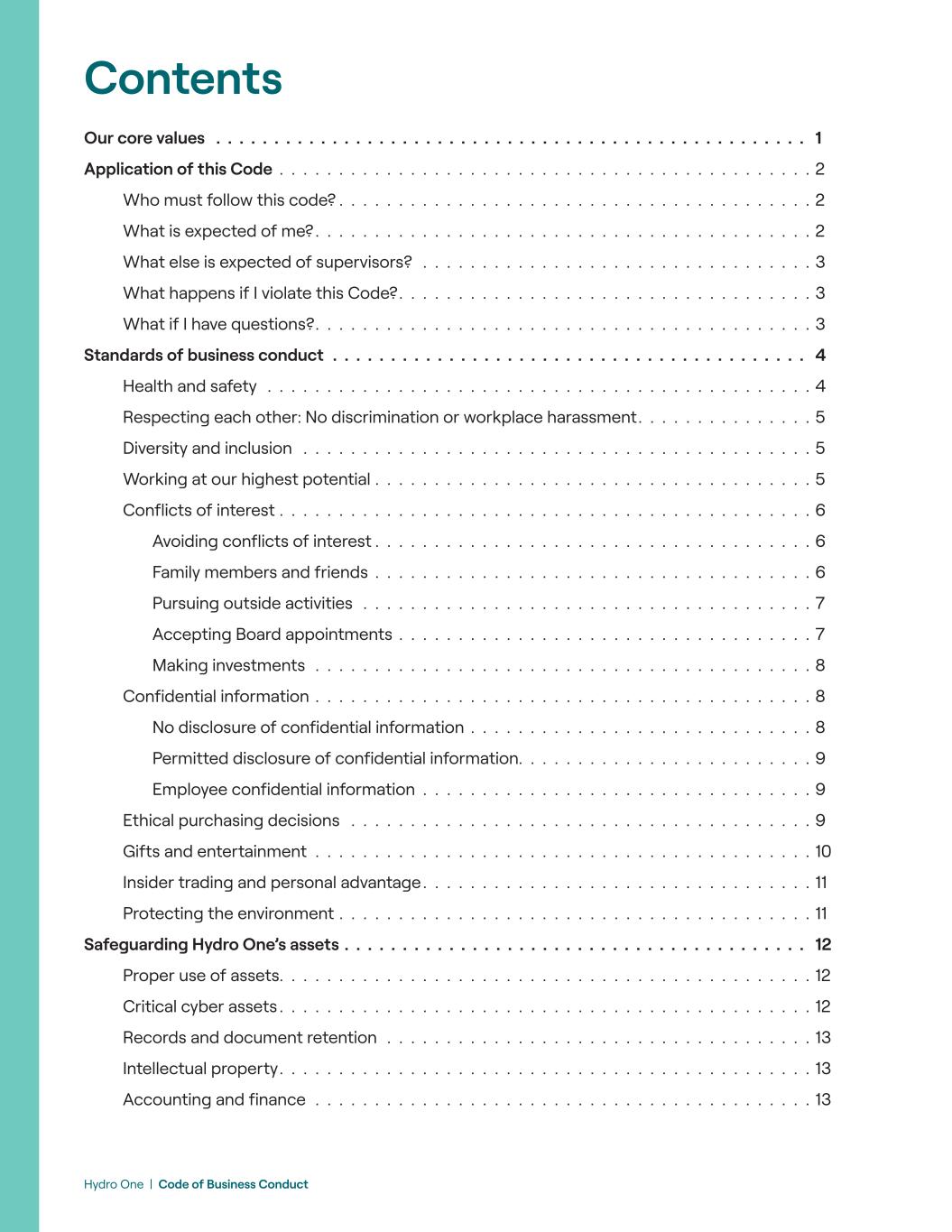 Hydro One | Code of Business Conduct Contents Our core values . . . . . . . . . . . . . . . . . . . . . . . . . . . . . . . . . . . . . . . . . . . . . . . . . . . . 1 Application of this Code . . . . . . . . . . . . . . . . . . . . . . . . . . . . . . . . . . . . . . . . . . . . . 2 Who must follow this code? . . . . . . . . . . . . . . . . . . . . . . . . . . . . . . . . . . . . . . . . 2 What is expected of me? . . . . . . . . . . . . . . . . . . . . . . . . . . . . . . . . . . . . . . . . . . 2 What else is expected of supervisors? . . . . . . . . . . . . . . . . . . . . . . . . . . . . . . . . . 3 What happens if I violate this Code? . . . . . . . . . . . . . . . . . . . . . . . . . . . . . . . . . . . 3 What if I have questions? . . . . . . . . . . . . . . . . . . . . . . . . . . . . . . . . . . . . . . . . . . 3 Standards of business conduct . . . . . . . . . . . . . . . . . . . . . . . . . . . . . . . . . . . . . . . . . . 4 Health and safety . . . . . . . . . . . . . . . . . . . . . . . . . . . . . . . . . . . . . . . . . . . . . . 4 Respecting each other: No discrimination or workplace harassment . . . . . . . . . . . . . . . 5 Diversity and inclusion . . . . . . . . . . . . . . . . . . . . . . . . . . . . . . . . . . . . . . . . . . . 5 Working at our highest potential . . . . . . . . . . . . . . . . . . . . . . . . . . . . . . . . . . . . . 5 Conflicts of interest . . . . . . . . . . . . . . . . . . . . . . . . . . . . . . . . . . . . . . . . . . . . . 6 Avoiding conflicts of interest . . . . . . . . . . . . . . . . . . . . . . . . . . . . . . . . . . . . . 6 Family members and friends . . . . . . . . . . . . . . . . . . . . . . . . . . . . . . . . . . . . . 6 Pursuing outside activities . . . . . . . . . . . . . . . . . . . . . . . . . . . . . . . . . . . . . . 7 Accepting Board appointments . . . . . . . . . . . . . . . . . . . . . . . . . . . . . . . . . . . 7 Making investments . . . . . . . . . . . . . . . . . . . . . . . . . . . . . . . . . . . . . . . . . . 8 Confidential information . . . . . . . . . . . . . . . . . . . . . . . . . . . . . . . . . . . . . . . . . . 8 No disclosure of confidential information . . . . . . . . . . . . . . . . . . . . . . . . . . . . . 8 Permitted disclosure of confidential information . . . . . . . . . . . . . . . . . . . . . . . . . 9 Employee confidential information . . . . . . . . . . . . . . . . . . . . . . . . . . . . . . . . . 9 Ethical purchasing decisions . . . . . . . . . . . . . . . . . . . . . . . . . . . . . . . . . . . . . . . 9 Gifts and entertainment . . . . . . . . . . . . . . . . . . . . . . . . . . . . . . . . . . . . . . . . . . 10 Insider trading and personal advantage . . . . . . . . . . . . . . . . . . . . . . . . . . . . . . . . . 11 Protecting the environment . . . . . . . . . . . . . . . . . . . . . . . . . . . . . . . . . . . . . . . . 11 Safeguarding Hydro One’s assets . . . . . . . . . . . . . . . . . . . . . . . . . . . . . . . . . . . . . . . . . 12 Proper use of assets . . . . . . . . . . . . . . . . . . . . . . . . . . . . . . . . . . . . . . . . . . . . . 12 Critical cyber assets . . . . . . . . . . . . . . . . . . . . . . . . . . . . . . . . . . . . . . . . . . . . . 12 Records and document retention . . . . . . . . . . . . . . . . . . . . . . . . . . . . . . . . . . . . 13 Intellectual property . . . . . . . . . . . . . . . . . . . . . . . . . . . . . . . . . . . . . . . . . . . . . 13 Accounting and finance . . . . . . . . . . . . . . . . . . . . . . . . . . . . . . . . . . . . . . . . . . 13