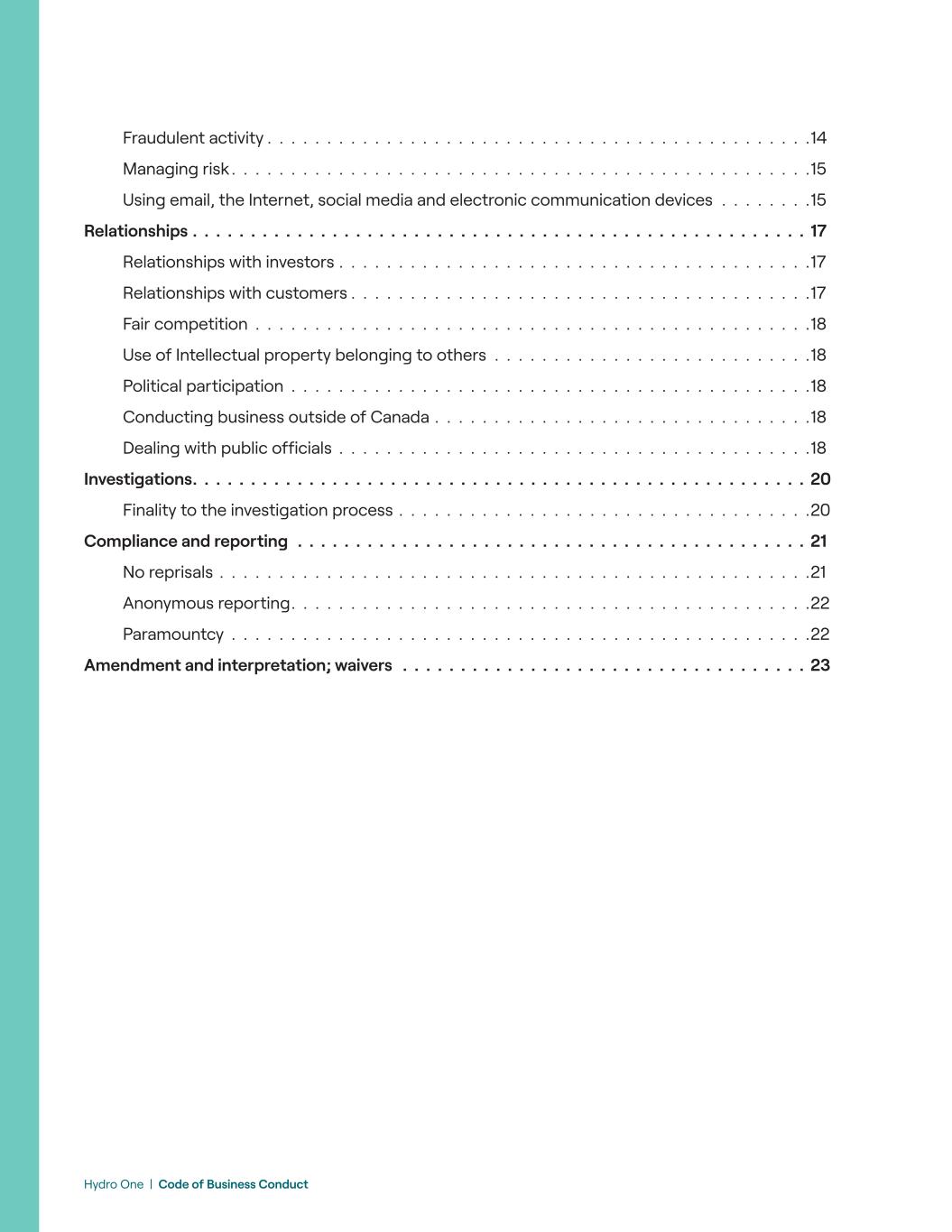 Hydro One | Code of Business Conduct Fraudulent activity . . . . . . . . . . . . . . . . . . . . . . . . . . . . . . . . . . . . . . . . . . . . . 14 Managing risk . . . . . . . . . . . . . . . . . . . . . . . . . . . . . . . . . . . . . . . . . . . . . . . . 15 Using email, the Internet, social media and electronic communication devices . . . . . . . . 15 Relationships . . . . . . . . . . . . . . . . . . . . . . . . . . . . . . . . . . . . . . . . . . . . . . . . . . . . . 17 Relationships with investors . . . . . . . . . . . . . . . . . . . . . . . . . . . . . . . . . . . . . . . . 17 Relationships with customers . . . . . . . . . . . . . . . . . . . . . . . . . . . . . . . . . . . . . . 17 Fair competition . . . . . . . . . . . . . . . . . . . . . . . . . . . . . . . . . . . . . . . . . . . . . . . 18 Use of Intellectual property belonging to others . . . . . . . . . . . . . . . . . . . . . . . . . . . 18 Political participation . . . . . . . . . . . . . . . . . . . . . . . . . . . . . . . . . . . . . . . . . . . . 18 Conducting business outside of Canada . . . . . . . . . . . . . . . . . . . . . . . . . . . . . . . . 18 Dealing with public officials . . . . . . . . . . . . . . . . . . . . . . . . . . . . . . . . . . . . . . . . 18 Investigations . . . . . . . . . . . . . . . . . . . . . . . . . . . . . . . . . . . . . . . . . . . . . . . . . . . . . 20 Finality to the investigation process . . . . . . . . . . . . . . . . . . . . . . . . . . . . . . . . . . . 20 Compliance and reporting . . . . . . . . . . . . . . . . . . . . . . . . . . . . . . . . . . . . . . . . . . . . 21 No reprisals . . . . . . . . . . . . . . . . . . . . . . . . . . . . . . . . . . . . . . . . . . . . . . . . . . 21 Anonymous reporting . . . . . . . . . . . . . . . . . . . . . . . . . . . . . . . . . . . . . . . . . . . 22 Paramountcy . . . . . . . . . . . . . . . . . . . . . . . . . . . . . . . . . . . . . . . . . . . . . . . . . 22 Amendment and interpretation; waivers . . . . . . . . . . . . . . . . . . . . . . . . . . . . . . . . . . . 23