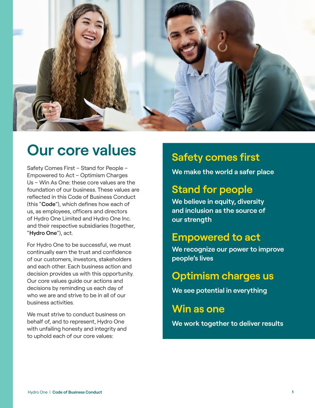 Hydro One | Code of Business Conduct 1 Our core values Safety Comes First – Stand for People – Empowered to Act – Optimism Charges Us – Win As One: these core values are the foundation of our business. These values are reflected in this Code of Business Conduct (this “Code”), which defines how each of us, as employees, officers and directors of Hydro One Limited and Hydro One Inc. and their respective subsidiaries (together, “Hydro One”), act. For Hydro One to be successful, we must continually earn the trust and confidence of our customers, investors, stakeholders and each other. Each business action and decision provides us with this opportunity. Our core values guide our actions and decisions by reminding us each day of who we are and strive to be in all of our business activities. We must strive to conduct business on behalf of, and to represent, Hydro One with unfailing honesty and integrity and to uphold each of our core values: Safety comes first We make the world a safer place Stand for people We believe in equity, diversity and inclusion as the source of our strength Empowered to act We recognize our power to improve people’s lives Optimism charges us We see potential in everything Win as one We work together to deliver results