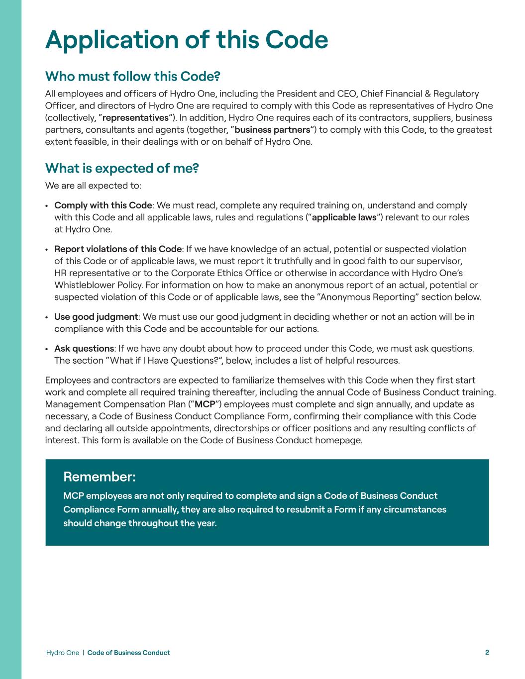 Hydro One | Code of Business Conduct 2 Application of this Code Who must follow this Code? All employees and officers of Hydro One, including the President and CEO, Chief Financial & Regulatory Officer, and directors of Hydro One are required to comply with this Code as representatives of Hydro One (collectively, “representatives”). In addition, Hydro One requires each of its contractors, suppliers, business partners, consultants and agents (together, “business partners”) to comply with this Code, to the greatest extent feasible, in their dealings with or on behalf of Hydro One. What is expected of me? We are all expected to: • Comply with this Code: We must read, complete any required training on, understand and comply with this Code and all applicable laws, rules and regulations (“applicable laws”) relevant to our roles at Hydro One. • Report violations of this Code: If we have knowledge of an actual, potential or suspected violation of this Code or of applicable laws, we must report it truthfully and in good faith to our supervisor, HR representative or to the Corporate Ethics Office or otherwise in accordance with Hydro One’s Whistleblower Policy. For information on how to make an anonymous report of an actual, potential or suspected violation of this Code or of applicable laws, see the “Anonymous Reporting” section below. • Use good judgment: We must use our good judgment in deciding whether or not an action will be in compliance with this Code and be accountable for our actions. • Ask questions: If we have any doubt about how to proceed under this Code, we must ask questions. The section “What if I Have Questions?”, below, includes a list of helpful resources. Employees and contractors are expected to familiarize themselves with this Code when they first start work and complete all required training thereafter, including the annual Code of Business Conduct training. Management Compensation Plan (“MCP”) employees must complete and sign annually, and update as necessary, a Code of Business Conduct Compliance Form, confirming their compliance with this Code and declaring all outside appointments, directorships or officer positions and any resulting conflicts of interest. This form is available on the Code of Business Conduct homepage. Remember: MCP employees are not only required to complete and sign a Code of Business Conduct Compliance Form annually, they are also required to resubmit a Form if any circumstances should change throughout the year.