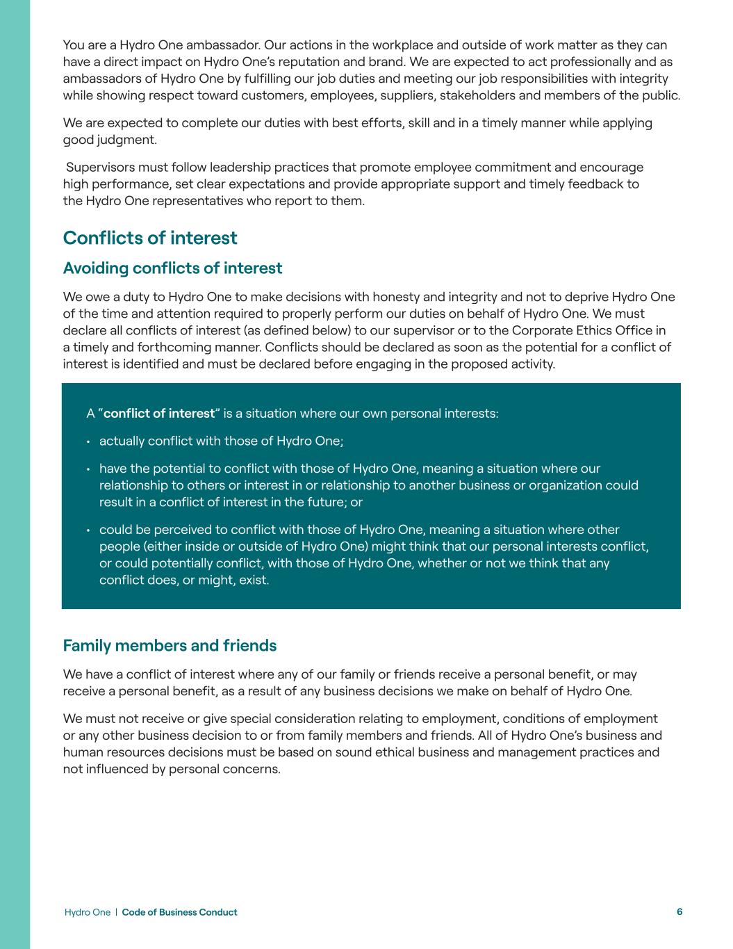 Hydro One | Code of Business Conduct 6 You are a Hydro One ambassador. Our actions in the workplace and outside of work matter as they can have a direct impact on Hydro One’s reputation and brand. We are expected to act professionally and as ambassadors of Hydro One by fulfilling our job duties and meeting our job responsibilities with integrity while showing respect toward customers, employees, suppliers, stakeholders and members of the public. We are expected to complete our duties with best efforts, skill and in a timely manner while applying good judgment. Supervisors must follow leadership practices that promote employee commitment and encourage high performance, set clear expectations and provide appropriate support and timely feedback to the Hydro One representatives who report to them. Conflicts of interest Avoiding conflicts of interest We owe a duty to Hydro One to make decisions with honesty and integrity and not to deprive Hydro One of the time and attention required to properly perform our duties on behalf of Hydro One. We must declare all conflicts of interest (as defined below) to our supervisor or to the Corporate Ethics Office in a timely and forthcoming manner. Conflicts should be declared as soon as the potential for a conflict of interest is identified and must be declared before engaging in the proposed activity. Family members and friends We have a conflict of interest where any of our family or friends receive a personal benefit, or may receive a personal benefit, as a result of any business decisions we make on behalf of Hydro One. We must not receive or give special consideration relating to employment, conditions of employment or any other business decision to or from family members and friends. All of Hydro One’s business and human resources decisions must be based on sound ethical business and management practices and not influenced by personal concerns. A “conflict of interest” is a situation where our own personal interests: • actually conflict with those of Hydro One; • have the potential to conflict with those of Hydro One, meaning a situation where our relationship to others or interest in or relationship to another business or organization could result in a conflict of interest in the future; or • could be perceived to conflict with those of Hydro One, meaning a situation where other people (either inside or outside of Hydro One) might think that our personal interests conflict, or could potentially conflict, with those of Hydro One, whether or not we think that any conflict does, or might, exist.