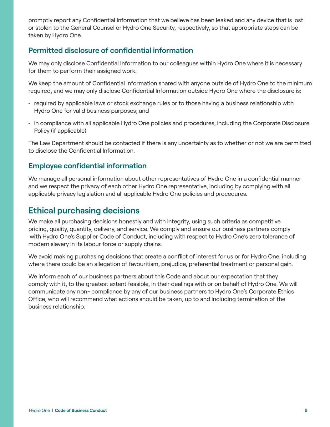 Hydro One | Code of Business Conduct 9 promptly report any Confidential Information that we believe has been leaked and any device that is lost or stolen to the General Counsel or Hydro One Security, respectively, so that appropriate steps can be taken by Hydro One. Permitted disclosure of confidential information We may only disclose Confidential Information to our colleagues within Hydro One where it is necessary for them to perform their assigned work. We keep the amount of Confidential Information shared with anyone outside of Hydro One to the minimum required, and we may only disclose Confidential Information outside Hydro One where the disclosure is: • required by applicable laws or stock exchange rules or to those having a business relationship with Hydro One for valid business purposes; and • in compliance with all applicable Hydro One policies and procedures, including the Corporate Disclosure Policy (if applicable). The Law Department should be contacted if there is any uncertainty as to whether or not we are permitted to disclose the Confidential Information. Employee confidential information We manage all personal information about other representatives of Hydro One in a confidential manner and we respect the privacy of each other Hydro One representative, including by complying with all applicable privacy legislation and all applicable Hydro One policies and procedures. Ethical purchasing decisions We make all purchasing decisions honestly and with integrity, using such criteria as competitive pricing, quality, quantity, delivery, and service. We comply and ensure our business partners comply with Hydro One’s Supplier Code of Conduct, including with respect to Hydro One’s zero tolerance of modern slavery in its labour force or supply chains. We avoid making purchasing decisions that create a conflict of interest for us or for Hydro One, including where there could be an allegation of favouritism, prejudice, preferential treatment or personal gain. We inform each of our business partners about this Code and about our expectation that they comply with it, to the greatest extent feasible, in their dealings with or on behalf of Hydro One. We will communicate any non- compliance by any of our business partners to Hydro One’s Corporate Ethics Office, who will recommend what actions should be taken, up to and including termination of the business relationship.