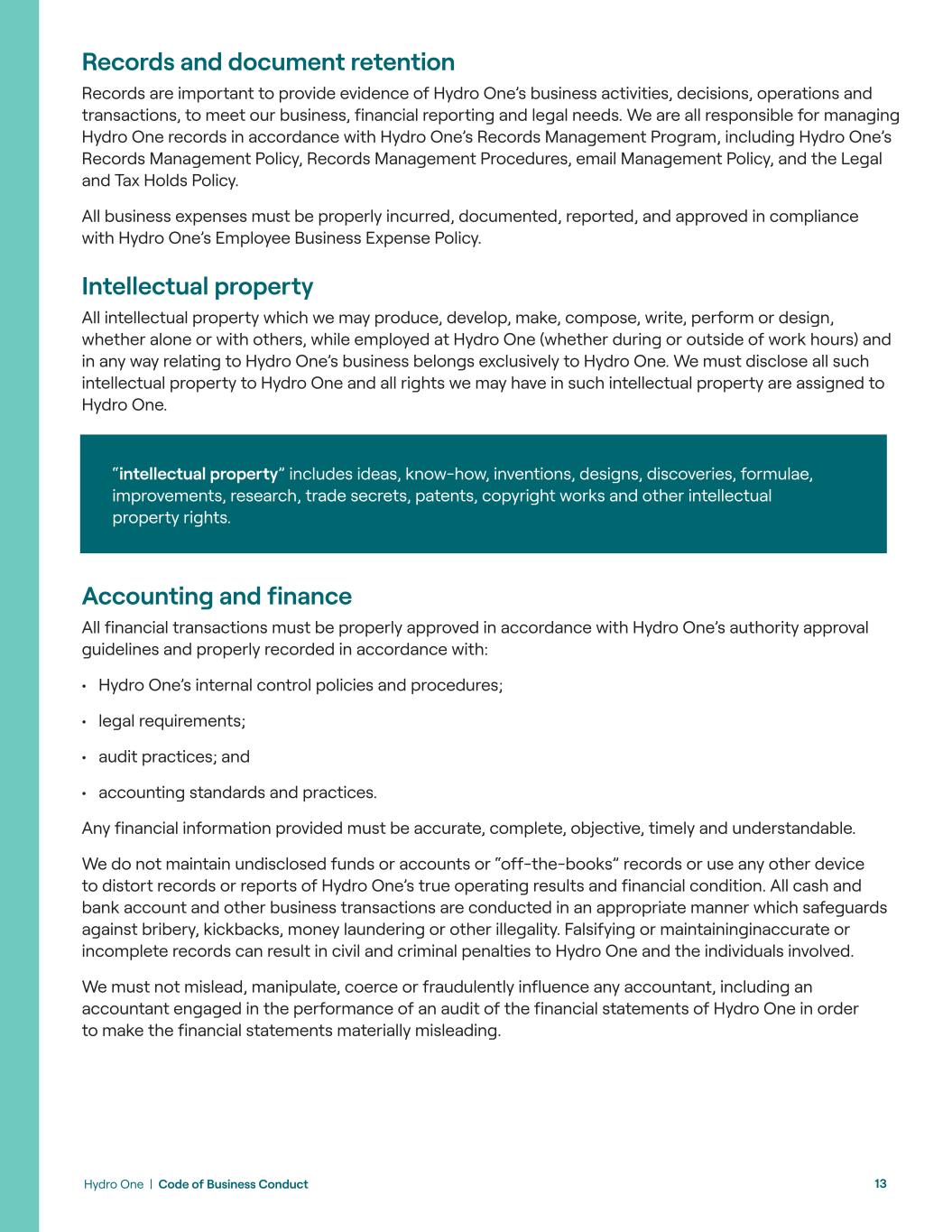 Hydro One | Code of Business Conduct 13 Records and document retention Records are important to provide evidence of Hydro One’s business activities, decisions, operations and transactions, to meet our business, financial reporting and legal needs. We are all responsible for managing Hydro One records in accordance with Hydro One’s Records Management Program, including Hydro One’s Records Management Policy, Records Management Procedures, email Management Policy, and the Legal and Tax Holds Policy. All business expenses must be properly incurred, documented, reported, and approved in compliance with Hydro One’s Employee Business Expense Policy. Intellectual property All intellectual property which we may produce, develop, make, compose, write, perform or design, whether alone or with others, while employed at Hydro One (whether during or outside of work hours) and in any way relating to Hydro One’s business belongs exclusively to Hydro One. We must disclose all such intellectual property to Hydro One and all rights we may have in such intellectual property are assigned to Hydro One. Accounting and finance All financial transactions must be properly approved in accordance with Hydro One’s authority approval guidelines and properly recorded in accordance with: • Hydro One’s internal control policies and procedures; • legal requirements; • audit practices; and • accounting standards and practices. Any financial information provided must be accurate, complete, objective, timely and understandable. We do not maintain undisclosed funds or accounts or “off-the-books” records or use any other device to distort records or reports of Hydro One’s true operating results and financial condition. All cash and bank account and other business transactions are conducted in an appropriate manner which safeguards against bribery, kickbacks, money laundering or other illegality. Falsifying or maintaininginaccurate or incomplete records can result in civil and criminal penalties to Hydro One and the individuals involved. We must not mislead, manipulate, coerce or fraudulently influence any accountant, including an accountant engaged in the performance of an audit of the financial statements of Hydro One in order to make the financial statements materially misleading. “intellectual property” includes ideas, know-how, inventions, designs, discoveries, formulae, improvements, research, trade secrets, patents, copyright works and other intellectual property rights.