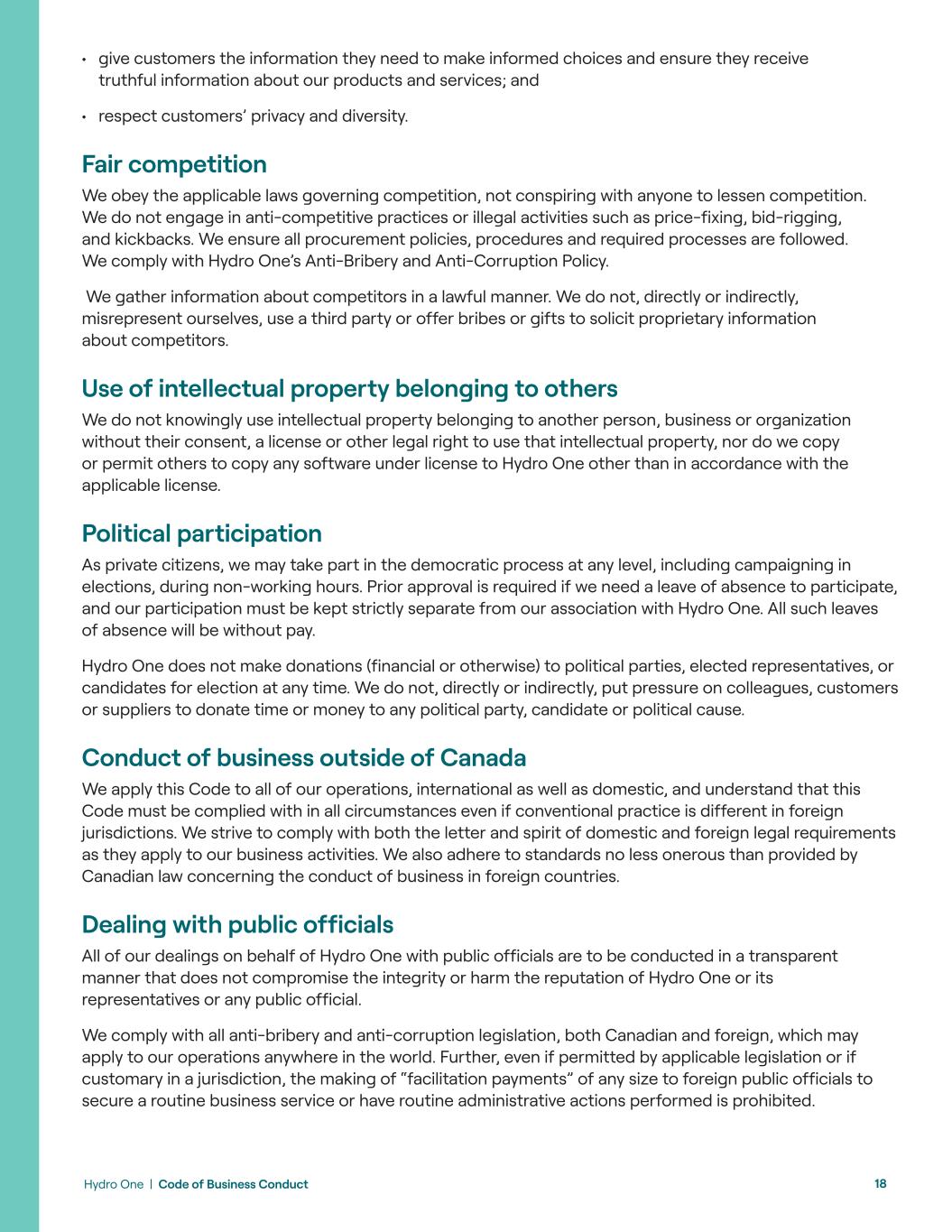 Hydro One | Code of Business Conduct 18 • give customers the information they need to make informed choices and ensure they receive truthful information about our products and services; and • respect customers’ privacy and diversity. Fair competition We obey the applicable laws governing competition, not conspiring with anyone to lessen competition. We do not engage in anti-competitive practices or illegal activities such as price-fixing, bid-rigging, and kickbacks. We ensure all procurement policies, procedures and required processes are followed. We comply with Hydro One’s Anti-Bribery and Anti-Corruption Policy. We gather information about competitors in a lawful manner. We do not, directly or indirectly, misrepresent ourselves, use a third party or offer bribes or gifts to solicit proprietary information about competitors. Use of intellectual property belonging to others We do not knowingly use intellectual property belonging to another person, business or organization without their consent, a license or other legal right to use that intellectual property, nor do we copy or permit others to copy any software under license to Hydro One other than in accordance with the applicable license. Political participation As private citizens, we may take part in the democratic process at any level, including campaigning in elections, during non-working hours. Prior approval is required if we need a leave of absence to participate, and our participation must be kept strictly separate from our association with Hydro One. All such leaves of absence will be without pay. Hydro One does not make donations (financial or otherwise) to political parties, elected representatives, or candidates for election at any time. We do not, directly or indirectly, put pressure on colleagues, customers or suppliers to donate time or money to any political party, candidate or political cause. Conduct of business outside of Canada We apply this Code to all of our operations, international as well as domestic, and understand that this Code must be complied with in all circumstances even if conventional practice is different in foreign jurisdictions. We strive to comply with both the letter and spirit of domestic and foreign legal requirements as they apply to our business activities. We also adhere to standards no less onerous than provided by Canadian law concerning the conduct of business in foreign countries. Dealing with public officials All of our dealings on behalf of Hydro One with public officials are to be conducted in a transparent manner that does not compromise the integrity or harm the reputation of Hydro One or its representatives or any public official. We comply with all anti-bribery and anti-corruption legislation, both Canadian and foreign, which may apply to our operations anywhere in the world. Further, even if permitted by applicable legislation or if customary in a jurisdiction, the making of “facilitation payments” of any size to foreign public officials to secure a routine business service or have routine administrative actions performed is prohibited.