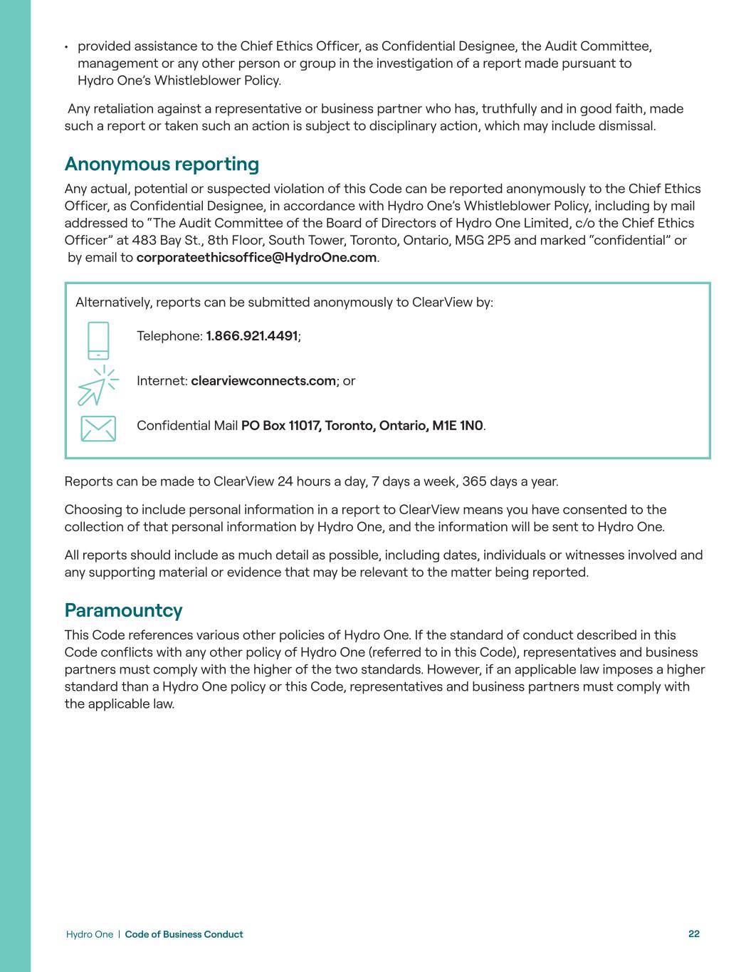 Hydro One | Code of Business Conduct 22 • provided assistance to the Chief Ethics Officer, as Confidential Designee, the Audit Committee, management or any other person or group in the investigation of a report made pursuant to Hydro One’s Whistleblower Policy. Any retaliation against a representative or business partner who has, truthfully and in good faith, made such a report or taken such an action is subject to disciplinary action, which may include dismissal. Anonymous reporting Any actual, potential or suspected violation of this Code can be reported anonymously to the Chief Ethics Officer, as Confidential Designee, in accordance with Hydro One’s Whistleblower Policy, including by mail addressed to “The Audit Committee of the Board of Directors of Hydro One Limited, c/o the Chief Ethics Officer” at 483 Bay St., 8th Floor, South Tower, Toronto, Ontario, M5G 2P5 and marked “confidential” or by email to corporateethicsoffice@HydroOne.com. Alternatively, reports can be submitted anonymously to ClearView by: Telephone: 1.866.921.4491; Internet: clearviewconnects.com; or Confidential Mail PO Box 11017, Toronto, Ontario, M1E 1N0. Reports can be made to ClearView 24 hours a day, 7 days a week, 365 days a year. Choosing to include personal information in a report to ClearView means you have consented to the collection of that personal information by Hydro One, and the information will be sent to Hydro One. All reports should include as much detail as possible, including dates, individuals or witnesses involved and any supporting material or evidence that may be relevant to the matter being reported. Paramountcy This Code references various other policies of Hydro One. If the standard of conduct described in this Code conflicts with any other policy of Hydro One (referred to in this Code), representatives and business partners must comply with the higher of the two standards. However, if an applicable law imposes a higher standard than a Hydro One policy or this Code, representatives and business partners must comply with the applicable law.