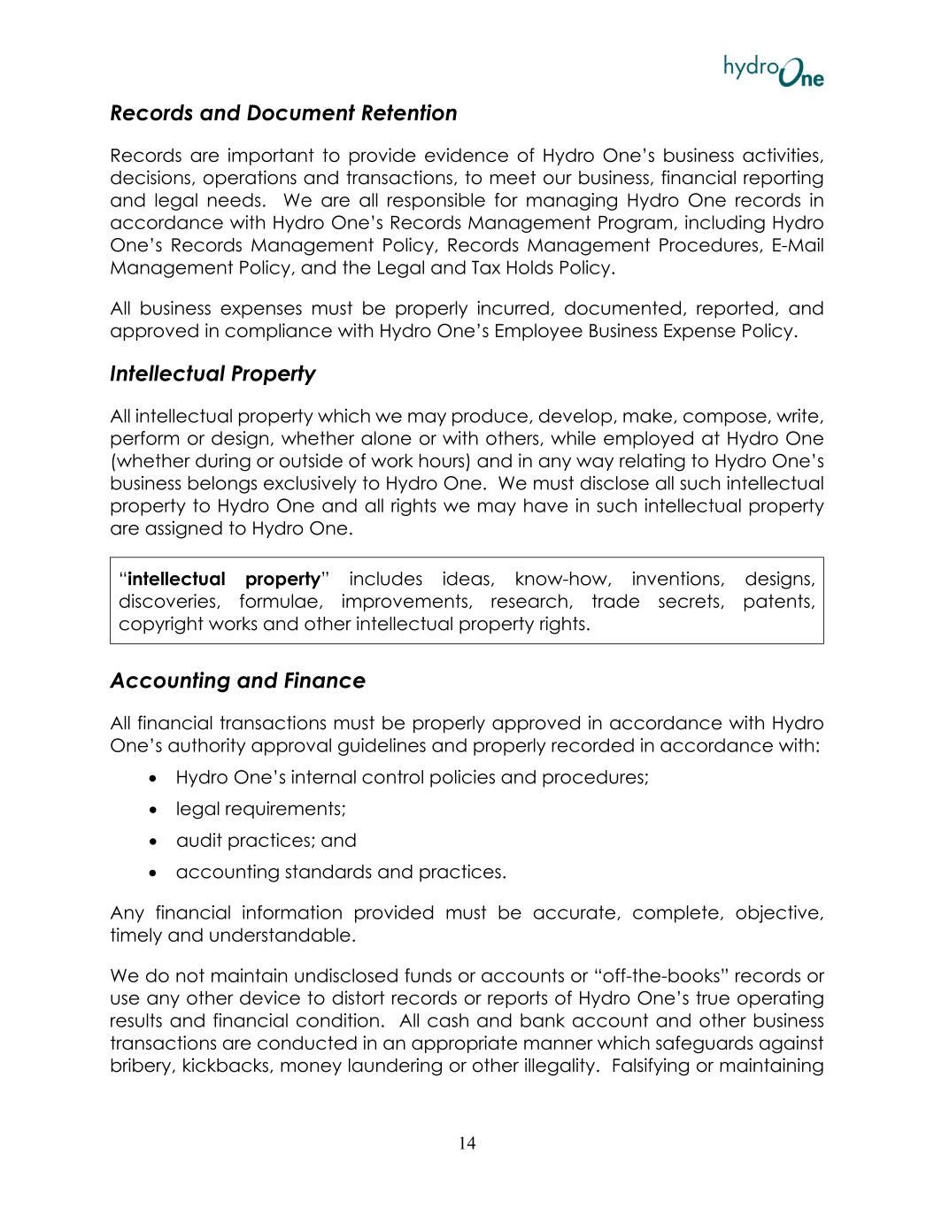 Records and Document Retention Records are important to provide evidence of Hydro One’s business activities, decisions, operations and transactions, to meet our business, financial reporting and legal needs. We are all responsible for managing Hydro One records in accordance with Hydro One’s Records Management Program, including Hydro One’s Records Management Policy, Records Management Procedures, E-Mail Management Policy, and the Legal and Tax Holds Policy. All business expenses must be properly incurred, documented, reported, and approved in compliance with Hydro One’s Employee Business Expense Policy. Intellectual Property All intellectual property which we may produce, develop, make, compose, write, perform or design, whether alone or with others, while employed at Hydro One (whether during or outside of work hours) and in any way relating to Hydro One’s business belongs exclusively to Hydro One. We must disclose all such intellectual property to Hydro One and all rights we may have in such intellectual property are assigned to Hydro One. “intellectual property” includes ideas, know-how, inventions, designs, discoveries, formulae, improvements, research, trade secrets, patents, copyright works and other intellectual property rights. Accounting and Finance All financial transactions must be properly approved in accordance with Hydro One’s authority approval guidelines and properly recorded in accordance with: • Hydro One’s internal control policies and procedures; • legal requirements; • audit practices; and • accounting standards and practices. Any financial information provided must be accurate, complete, objective, timely and understandable. We do not maintain undisclosed funds or accounts or “off-the-books” records or use any other device to distort records or reports of Hydro One’s true operating results and financial condition. All cash and bank account and other business transactions are conducted in an appropriate manner which safeguards against bribery, kickbacks, money laundering or other illegality. Falsifying or maintaining 14