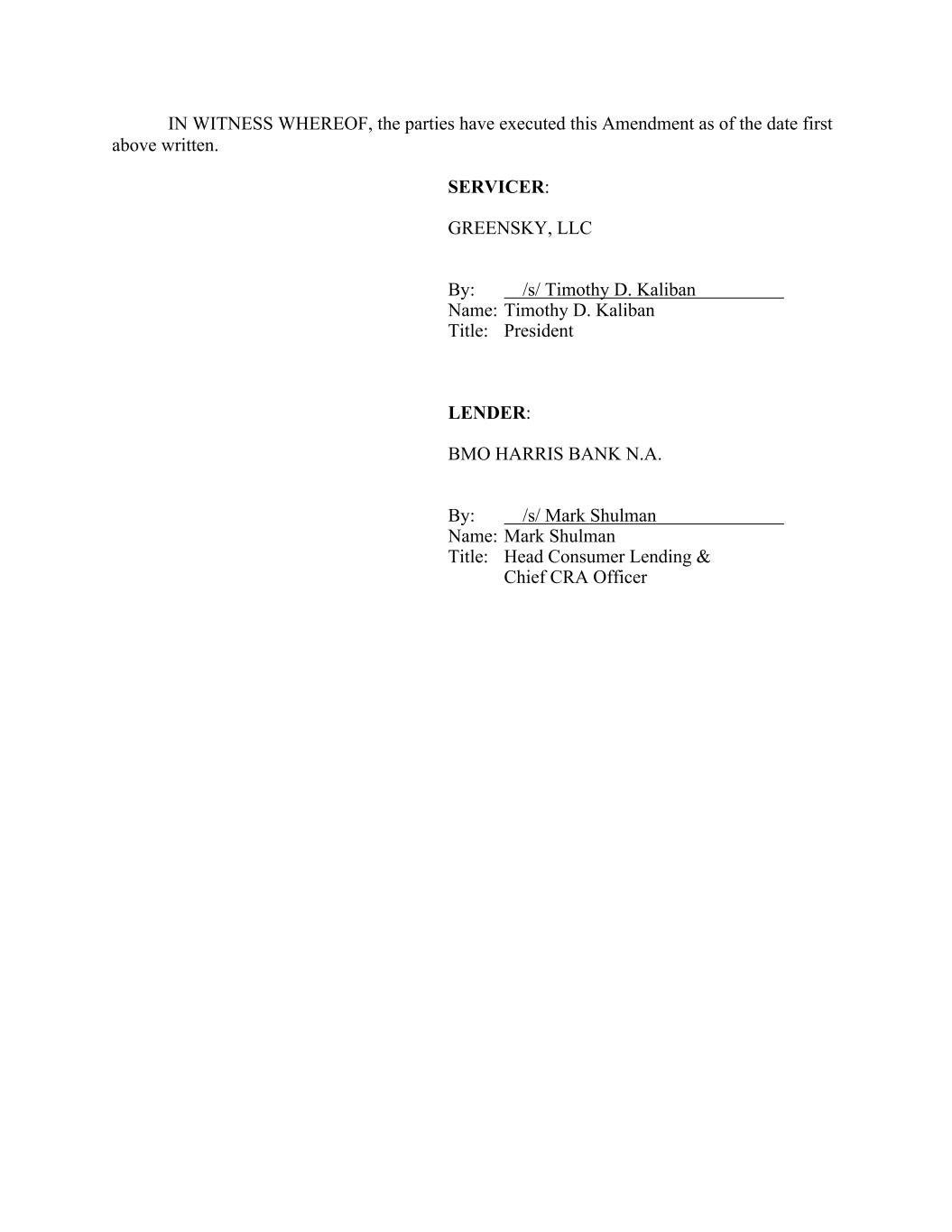 IN WITNESS WHEREOF, the parties have executed this Amendment as of the date first above written. SERVICER: GREENSKY, LLC By: /s/ Timothy D. Kaliban Name: Timothy D. Kaliban Title: President LENDER: BMO HARRIS BANK N.A. By: /s/ Mark Shulman Name: Mark Shulman Title: Head Consumer Lending & Chief CRA Officer