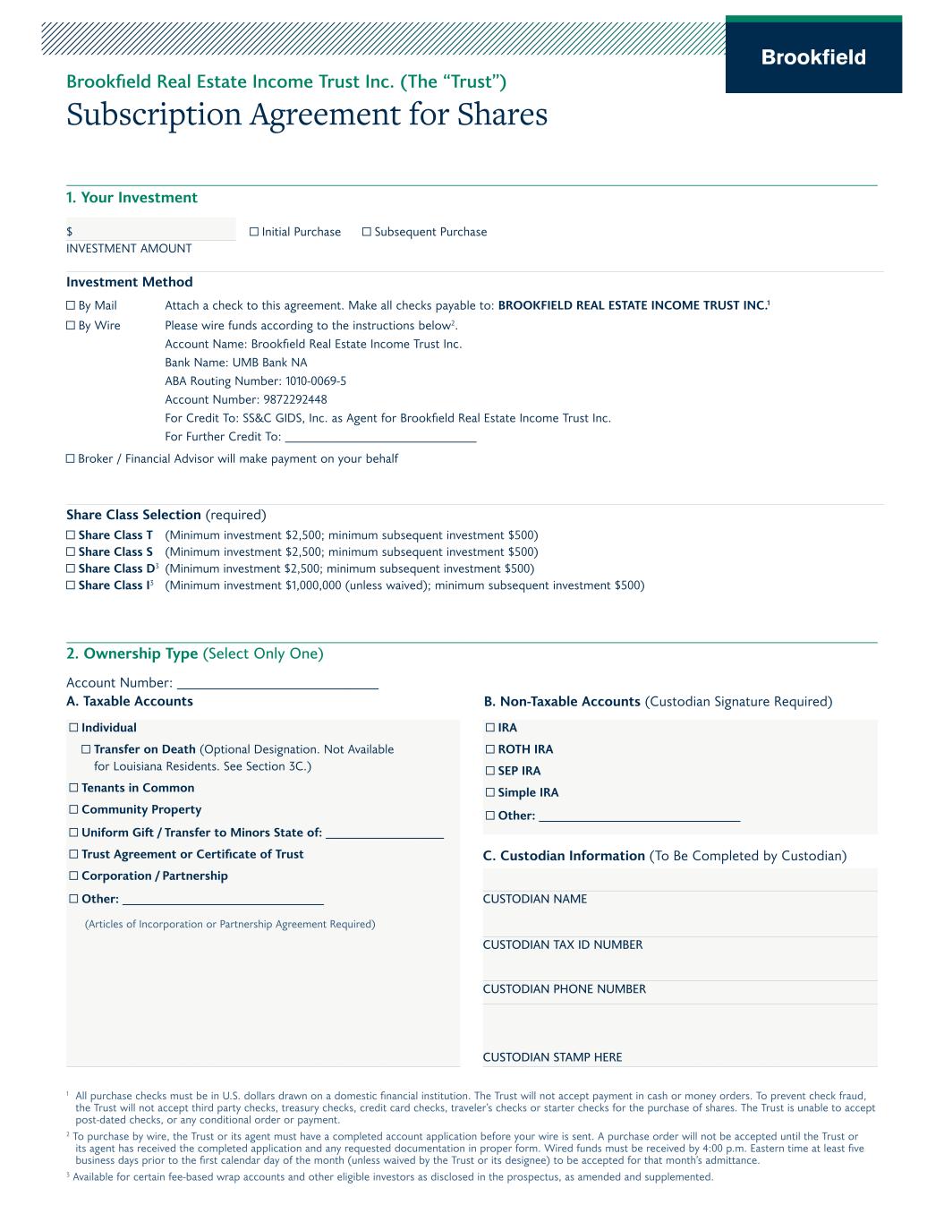 Investment Method By Mail Attach a check to this agreement. Make all checks payable to: BROOKFIELD REAL ESTATE INCOME TRUST INC.1 By Wire Please wire funds according to the instructions below2. Account Name: Brookfield Real Estate Income Trust Inc. Bank Name: UMB Bank NA ABA Routing Number: 1010-0069-5 Account Number: 9872292448 For Credit To: SS&C GIDS, Inc. as Agent for Brookfield Real Estate Income Trust Inc. For Further Credit To: _______________________________ Share Class Selection (required) Share Class T (Minimum investment $2,500; minimum subsequent investment $500) Share Class S (Minimum investment $2,500; minimum subsequent investment $500) Share Class D3 (Minimum investment $2,500; minimum subsequent investment $500) Share Class I3 (Minimum investment $1,000,000 (unless waived); minimum subsequent investment $500) 1. Your Investment $ Initial Purchase Subsequent Purchase INVESTMENT AMOUNT 2. Ownership Type (Select Only One) Account Number: _____________________________ A. Taxable Accounts Individual Transfer on Death (Optional Designation. Not Available for Louisiana Residents. See Section 3C.) Tenants in Common Community Property Uniform Gift / Transfer to Minors State of: _________________ Trust Agreement or Certificate of Trust Corporation / Partnership Other: _____________________________ (Articles of Incorporation or Partnership Agreement Required) IRA ROTH IRA SEP IRA Simple IRA Other: _____________________________ C. Custodian Information (To Be Completed by Custodian) CUSTODIAN NAME CUSTODIAN TAX ID NUMBER CUSTODIAN PHONE NUMBER Brookfield Real Estate Income Trust Inc. (The “Trust”) Subscription Agreement for Shares 1 All purchase checks must be in U.S. dollars drawn on a domestic financial institution. The Trust will not accept payment in cash or money orders. To prevent check fraud, the Trust will not accept third party checks, treasury checks, credit card checks, traveler’s checks or starter checks for the purchase of shares. The Trust is unable to accept post-dated checks, or any conditional order or payment. 2 To purchase by wire, the Trust or its agent must have a completed account application before your wire is sent. A purchase order will not be accepted until the Trust or its agent has received the completed application and any requested documentation in proper form. Wired funds must be received by 4:00 p.m. Eastern time at least five business days prior to the first calendar day of the month (unless waived by the Trust or its designee) to be accepted for that month’s admittance. 3 Available for certain fee-based wrap accounts and other eligible investors as disclosed in the prospectus, as amended and supplemented. B. Non-Taxable Accounts (Custodian Signature Required) CUSTODIAN STAMP HERE Broker / Financial Advisor will make payment on your behalf