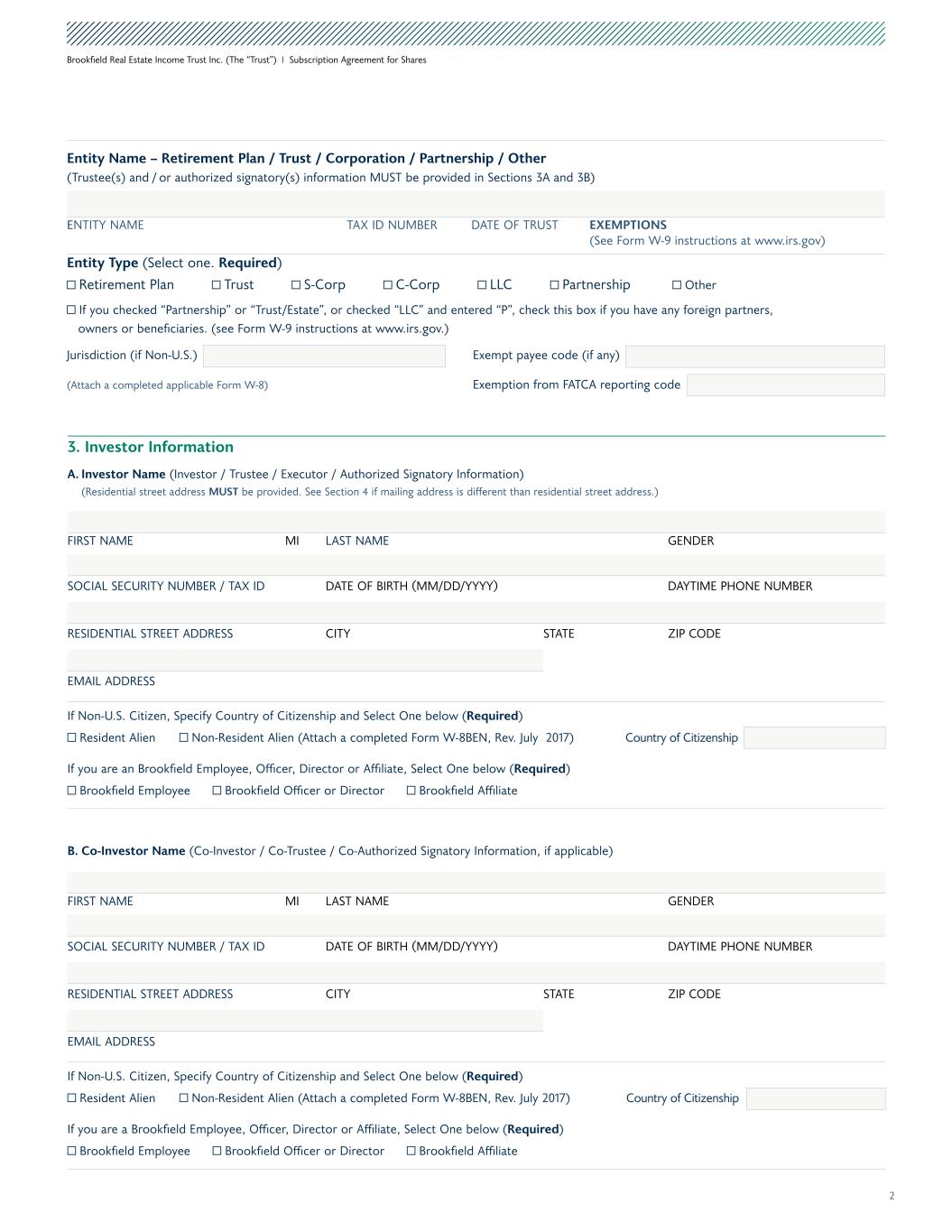 2 Brookfield Real Estate Income Trust Inc. (The “Trust”) I Subscription Agreement for Shares Entity Name – Retirement Plan / Trust / Corporation / Partnership / Other (Trustee(s) and / or authorized signatory(s) information MUST be provided in Sections 3A and 3B) ENTITY NAME TAX ID NUMBER DATE OF TRUST EXEMPTIONS (See Form W-9 instructions at www.irs.gov) Entity Type (Select one. Required) Retirement Plan Trust S-Corp C-Corp LLC Partnership Other If you checked “Partnership” or “Trust/Estate”, or checked “LLC” and entered “P”, check this box if you have any foreign partners, owners or beneficiaries. (see Form W-9 instructions at www.irs.gov.) Jurisdiction (if Non-U.S.) Exempt payee code (if any) (Attach a completed applicable Form W-8) Exemption from FATCA reporting code B. Co-Investor Name (Co-Investor / Co-Trustee / Co-Authorized Signatory Information, if applicable) FIRST NAME MI LAST NAME GENDER SOCIAL SECURITY NUMBER / TAX ID DATE OF BIRTH (MM/DD/YYYY) DAYTIME PHONE NUMBER RESIDENTIAL STREET ADDRESS CITY STATE ZIP CODE EMAIL ADDRESS If Non-U.S. Citizen, Specify Country of Citizenship and Select One below (Required) Resident Alien Non-Resident Alien (Attach a completed Form W-8BEN, Rev. July 2017) Country of Citizenship If you are a Brookfield Employee, Officer, Director or Affiliate, Select One below (Required) Brookfield Employee Brookfield Officer or Director Brookfield Affiliate 3. Investor Information A. Investor Name (Investor / Trustee / Executor / Authorized Signatory Information) (Residential street address MUST be provided. See Section 4 if mailing address is different than residential street address.) FIRST NAME MI LAST NAME GENDER SOCIAL SECURITY NUMBER / TAX ID DATE OF BIRTH (MM/DD/YYYY) DAYTIME PHONE NUMBER RESIDENTIAL STREET ADDRESS CITY STATE ZIP CODE EMAIL ADDRESS If Non-U.S. Citizen, Specify Country of Citizenship and Select One below (Required) Resident Alien Non-Resident Alien (Attach a completed Form W-8BEN, Rev. July 2017) Country of Citizenship If you are an Brookfield Employee, Officer, Director or Affiliate, Select One below (Required) Brookfield Employee Brookfield Officer or Director Brookfield Affiliate