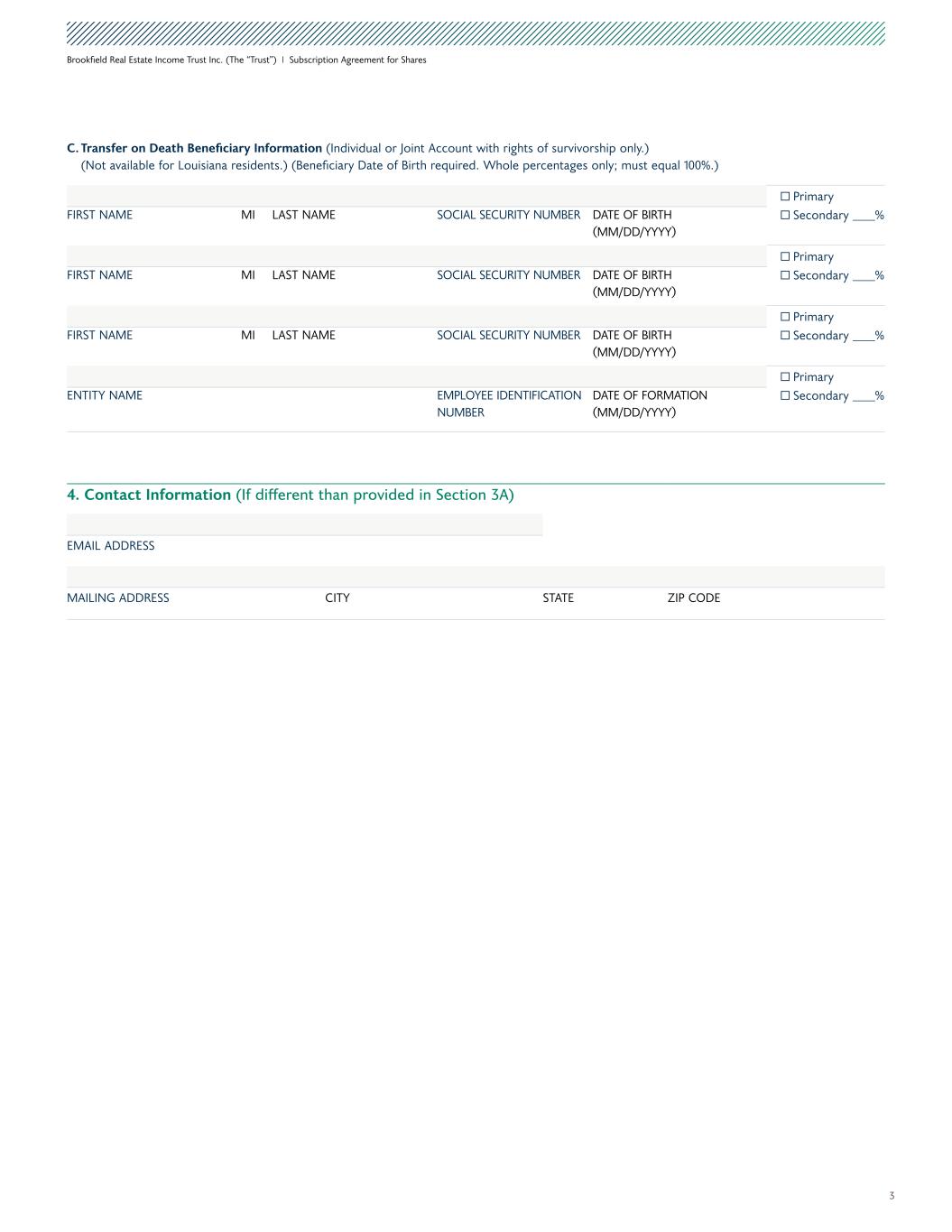 3 Brookfield Real Estate Income Trust Inc. (The “Trust”) I Subscription Agreement for Shares C. Transfer on Death Beneficiary Information (Individual or Joint Account with rights of survivorship only.) (Not available for Louisiana residents.) (Beneficiary Date of Birth required. Whole percentages only; must equal 100%.) Primary Secondary %FIRST NAME MI LAST NAME SOCIAL SECURITY NUMBER DATE OF BIRTH (MM/DD/YYYY) Primary Secondary %FIRST NAME MI LAST NAME SOCIAL SECURITY NUMBER DATE OF BIRTH (MM/DD/YYYY) Primary Secondary %FIRST NAME MI LAST NAME SOCIAL SECURITY NUMBER DATE OF BIRTH (MM/DD/YYYY) Primary Secondary %ENTITY NAME EMPLOYEE IDENTIFICATION NUMBER DATE OF FORMATION (MM/DD/YYYY) 4. Contact Information (If different than provided in Section 3A) EMAIL ADDRESS MAILING ADDRESS CITY STATE ZIP CODE