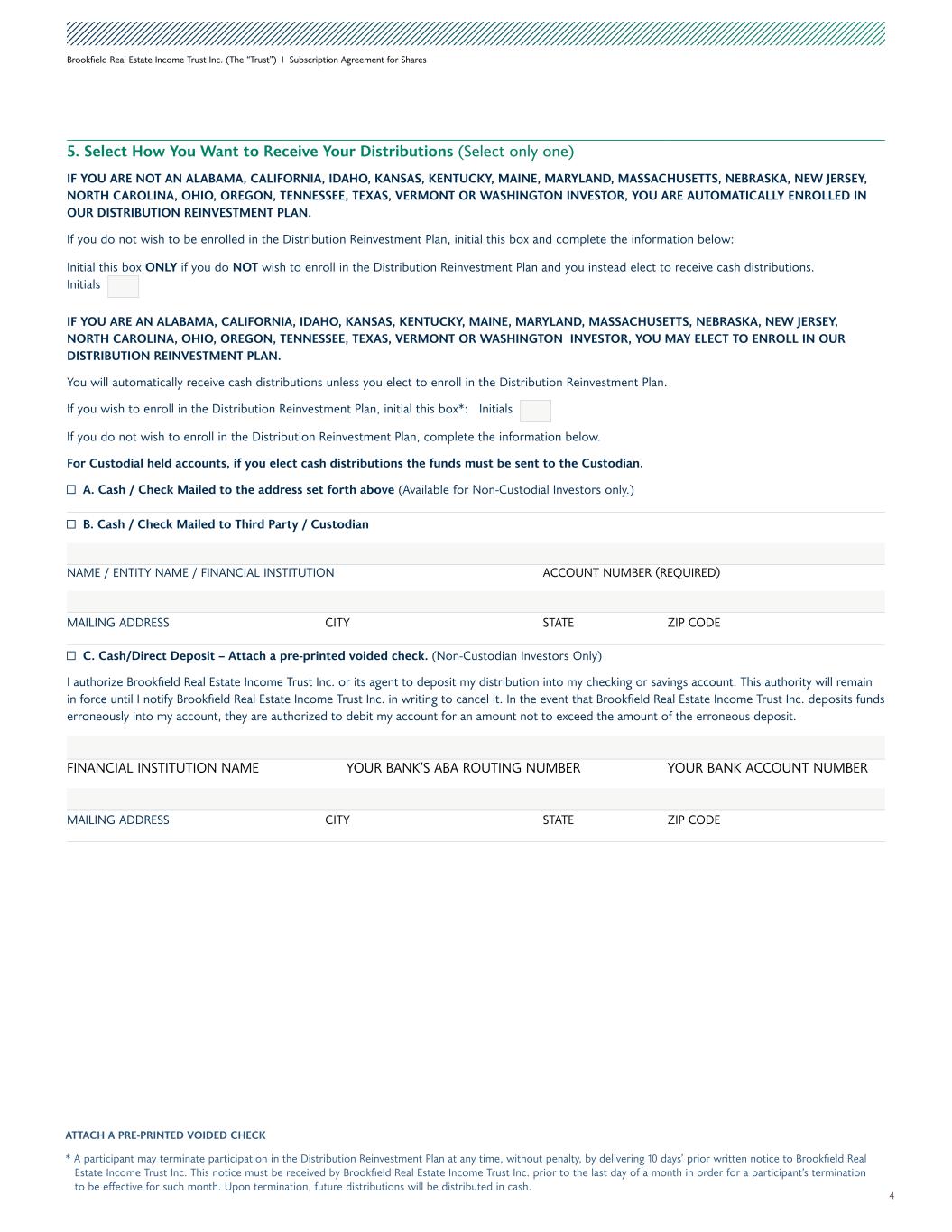 4 Brookfield Real Estate Income Trust Inc. (The “Trust”) I Subscription Agreement for Shares ATTACH A PRE-PRINTED VOIDED CHECK * A participant may terminate participation in the Distribution Reinvestment Plan at any time, without penalty, by delivering 10 days’ prior written notice to Brookfield Real Estate Income Trust Inc. This notice must be received by Brookfield Real Estate Income Trust Inc. prior to the last day of a month in order for a participant’s termination to be effective for such month. Upon termination, future distributions will be distributed in cash. 5. Select How You Want to Receive Your Distributions (Select only one) IF YOU ARE NOT AN ALABAMA, CALIFORNIA, IDAHO, KANSAS, KENTUCKY, MAINE, MARYLAND, MASSACHUSETTS, NEBRASKA, NEW JERSEY, NORTH CAROLINA, OHIO, OREGON, TENNESSEE, TEXAS, VERMONT OR WASHINGTON INVESTOR, YOU ARE AUTOMATICALLY ENROLLED IN OUR DISTRIBUTION REINVESTMENT PLAN. If you do not wish to be enrolled in the Distribution Reinvestment Plan, initial this box and complete the information below: Initial this box ONLY if you do NOT wish to enroll in the Distribution Reinvestment Plan and you instead elect to receive cash distributions. Initials IF YOU ARE AN ALABAMA, CALIFORNIA, IDAHO, KANSAS, KENTUCKY, MAINE, MARYLAND, MASSACHUSETTS, NEBRASKA, NEW JERSEY, NORTH CAROLINA, OHIO, OREGON, TENNESSEE, TEXAS, VERMONT OR WASHINGTON INVESTOR, YOU MAY ELECT TO ENROLL IN OUR DISTRIBUTION REINVESTMENT PLAN. You will automatically receive cash distributions unless you elect to enroll in the Distribution Reinvestment Plan. If you wish to enroll in the Distribution Reinvestment Plan, initial this box*: Initials If you do not wish to enroll in the Distribution Reinvestment Plan, complete the information below. For Custodial held accounts, if you elect cash distributions the funds must be sent to the Custodian. A. Cash / Check Mailed to the address set forth above (Available for Non-Custodial Investors only.) B. Cash / Check Mailed to Third Party / Custodian NAME / ENTITY NAME / FINANCIAL INSTITUTION ACCOUNT NUMBER (REQUIRED) MAILING ADDRESS CITY STATE ZIP CODE C. Cash/Direct Deposit – Attach a pre-printed voided check. (Non-Custodian Investors Only) I authorize Brookfield Real Estate Income Trust Inc. or its agent to deposit my distribution into my checking or savings account. This authority will remain in force until I notify Brookfield Real Estate Income Trust Inc. in writing to cancel it. In the event that Brookfield Real Estate Income Trust Inc. deposits funds erroneously into my account, they are authorized to debit my account for an amount not to exceed the amount of the erroneous deposit. FINANCIAL INSTITUTION NAME YOUR BANK’S ABA ROUTING NUMBER YOUR BANK ACCOUNT NUMBER MAILING ADDRESS CITY STATE ZIP CODE