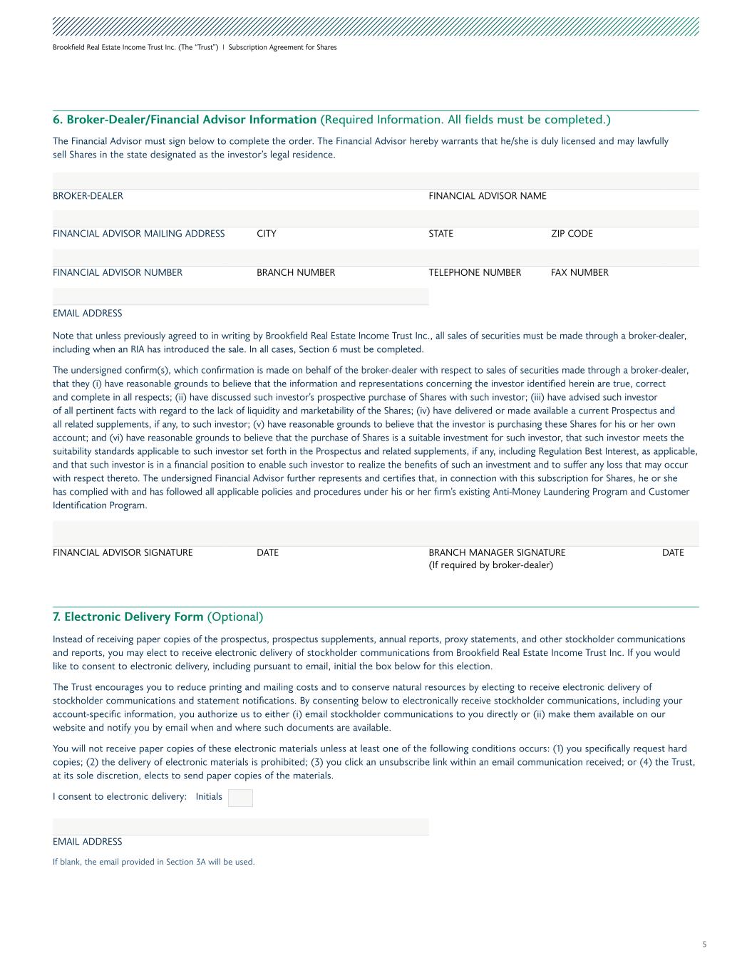 5 Brookfield Real Estate Income Trust Inc. (The “Trust”) I Subscription Agreement for Shares 6. Broker-Dealer/Financial Advisor Information (Required Information. All fields must be completed.) The Financial Advisor must sign below to complete the order. The Financial Advisor hereby warrants that he/she is duly licensed and may lawfully sell Shares in the state designated as the investor’s legal residence. BROKER-DEALER FINANCIAL ADVISOR NAME FINANCIAL ADVISOR MAILING ADDRESS CITY STATE ZIP CODE FINANCIAL ADVISOR NUMBER BRANCH NUMBER TELEPHONE NUMBER FAX NUMBER EMAIL ADDRESS Note that unless previously agreed to in writing by Brookfield Real Estate Income Trust Inc., all sales of securities must be made through a broker-dealer, including when an RIA has introduced the sale. In all cases, Section 6 must be completed. The undersigned confirm(s), which confirmation is made on behalf of the broker-dealer with respect to sales of securities made through a broker-dealer, that they (i) have reasonable grounds to believe that the information and representations concerning the investor identified herein are true, correct and complete in all respects; (ii) have discussed such investor’s prospective purchase of Shares with such investor; (iii) have advised such investor of all pertinent facts with regard to the lack of liquidity and marketability of the Shares; (iv) have delivered or made available a current Prospectus and all related supplements, if any, to such investor; (v) have reasonable grounds to believe that the investor is purchasing these Shares for his or her own account; and (vi) have reasonable grounds to believe that the purchase of Shares is a suitable investment for such investor, that such investor meets the suitability standards applicable to such investor set forth in the Prospectus and related supplements, if any, including Regulation Best Interest, as applicable, and that such investor is in a financial position to enable such investor to realize the benefits of such an investment and to suffer any loss that may occur with respect thereto. The undersigned Financial Advisor further represents and certifies that, in connection with this subscription for Shares, he or she has complied with and has followed all applicable policies and procedures under his or her firm’s existing Anti-Money Laundering Program and Customer Identification Program. FINANCIAL ADVISOR SIGNATURE DATE BRANCH MANAGER SIGNATURE (If required by broker-dealer) DATE EMAIL ADDRESS If blank, the email provided in Section 3A will be used. 7. Electronic Delivery Form (Optional) Instead of receiving paper copies of the prospectus, prospectus supplements, annual reports, proxy statements, and other stockholder communications and reports, you may elect to receive electronic delivery of stockholder communications from Brookfield Real Estate Income Trust Inc. If you would like to consent to electronic delivery, including pursuant to email, initial the box below for this election. The Trust encourages you to reduce printing and mailing costs and to conserve natural resources by electing to receive electronic delivery of stockholder communications and statement notifications. By consenting below to electronically receive stockholder communications, including your account-specific information, you authorize us to either (i) email stockholder communications to you directly or (ii) make them available on our website and notify you by email when and where such documents are available. You will not receive paper copies of these electronic materials unless at least one of the following conditions occurs: (1) you specifically request hard copies; (2) the delivery of electronic materials is prohibited; (3) you click an unsubscribe link within an email communication received; or (4) the Trust, at its sole discretion, elects to send paper copies of the materials. I consent to electronic delivery: Initials