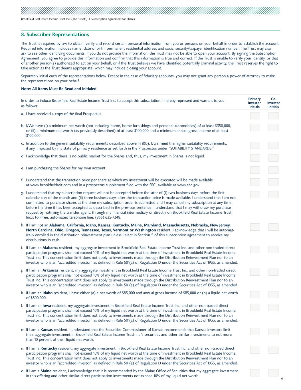 6 Brookfield Real Estate Income Trust Inc. (The “Trust”) I Subscription Agreement for Shares 8. Subscriber Representations The Trust is required by law to obtain, verify and record certain personal information from you or persons on your behalf in order to establish the account. Required information includes name, date of birth, permanent residential address and social security/taxpayer identification number. The Trust may also ask to see other identifying documents. If you do not provide the information, the Trust may not be able to open your account. By signing the Subscription Agreement, you agree to provide this information and confirm that this information is true and correct. If the Trust is unable to verify your identity, or that of another person(s) authorized to act on your behalf, or if the Trust believes we have identified potentially criminal activity, the Trust reserves the right to take action as the Trust deems appropriate, which may include closing your account. Separately initial each of the representations below. Except in the case of fiduciary accounts, you may not grant any person a power of attorney to make the representations on your behalf. Note: All Items Must Be Read and Initialed In order to induce Brookfield Real Estate Income Trust Inc. to accept this subscription, I hereby represent and warrant to you as follows: a. I have received a copy of the final Prospectus. b. I/We have (i) a minimum net worth (not including home, home furnishings and personal automobiles) of at least $350,000, or (ii) a minimum net worth (as previously described) of at least $100,000 and a minimum annual gross income of at least $100,000. c. In addition to the general suitability requirements described above in 8(b), I/we meet the higher suitability requirements, if any, imposed by my state of primary residence as set forth in the Prospectus under “SUITABILITY STANDARDS.” d. I acknowledge that there is no public market for the Shares and, thus, my investment in Shares is not liquid. e. I am purchasing the Shares for my own account. f. I understand that the transaction price per share at which my investment will be executed will be made available at www.brookfieldreit.com and in a prospectus supplement filed with the SEC, available at www.sec.gov. g. I understand that my subscription request will not be accepted before the later of (i) two business days before the first calendar day of the month and (ii) three business days after the transaction price is made available. I understand that I am not committed to purchase shares at the time my subscription order is submitted and I may cancel my subscription at any time before the time it has been accepted as described in the previous sentence. I understand that I may withdraw my purchase request by notifying the transfer agent, through my financial intermediary or directly on Brookfield Real Estate Income Trust Inc.’s toll-free, automated telephone line, (833) 625-7348. h. If I am not an Alabama, California, Idaho, Kansas, Kentucky, Maine, Maryland, Massachusetts, Nebraska, New Jersey, North Carolina, Ohio, Oregon, Tennessee, Texas, Vermont or Washington resident, I acknowledge that I will be automat- ically enrolled in the distribution reinvestment plan unless I elect in Section 5 of this subscription agreement to receive my distributions in cash. i. If I am an Alabama resident, my aggregate investment in Brookfield Real Estate Income Trust Inc. and other non-traded direct participation programs shall not exceed 10% of my liquid net worth at the time of investment in Brookfield Real Estate Income Trust Inc. This concentration limit does not apply to investments made through the Distribution Reinvestment Plan nor to an investor who is an “accredited investor” as defined in Rule 501(a) of Regulation D under the Securities Act of 1933, as amended. j. If I am an Arkansas resident, my aggregate investment in Brookfield Real Estate Income Trust Inc. and other non-traded direct participation programs shall not exceed 10% of my liquid net worth at the time of investment in Brookfield Real Estate Income Trust Inc. This concentration limit does not apply to investments made through the Distribution Reinvestment Plan nor to an investor who is an “accredited investor” as defined in Rule 501(a) of Regulation D under the Securities Act of 1933, as amended. k. If I am an Idaho resident, I have either (a) a net worth of $85,000 and annual gross income of $85,000 or (b) a liquid net worth of $300,000. l. If I am an Iowa resident, my aggregate investment in Brookfield Real Estate Income Trust Inc. and other non-traded direct participation programs shall not exceed 10% of my liquid net worth at the time of investment in Brookfield Real Estate Income Trust Inc. This concentration limit does not apply to investments made through the Distribution Reinvestment Plan nor to an investor who is an “accredited investor” as defined in Rule 501(a) of Regulation D under the Securities Act of 1933, as amended. m. If I am a Kansas resident, I understand that the Securities Commissioner of Kansas recommends that Kansas investors limit their aggregate investment in Brookfield Real Estate Income Trust Inc.’s securities and other similar investments to not more than 10 percent of their liquid net worth. n. If I am a Kentucky resident, my aggregate investment in Brookfield Real Estate Income Trust Inc. and other non-traded direct participation programs shall not exceed 10% of my liquid net worth at the time of investment in Brookfield Real Estate Income Trust Inc. This concentration limit does not apply to investments made through the Distribution Reinvestment Plan nor to an investor who is an “accredited investor” as defined in Rule 501(a) of Regulation D under the Securities Act of 1933, as amended. o. If I am a Maine resident, I acknowledge that it is recommended by the Maine Office of Securities that my aggregate investment in this offering and 