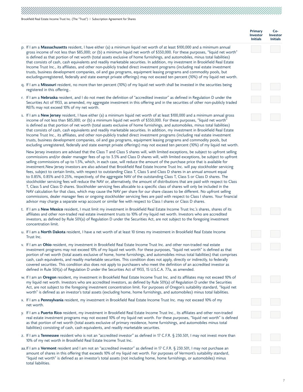 7 Brookfield Real Estate Income Trust Inc. (The “Trust”) I Subscription Agreement for Shares p. If I am a Massachusetts resident, I have either (a) a minimum liquid net worth of at least $100,000 and a minimum annual gross income of not less than $85,000; or (b) a minimum liquid net worth of $350,000. For these purposes, “liquid net worth” is defined as that portion of net worth (total assets exclusive of home furnishings, and automobiles, minus total liabilities) that consists of cash, cash equivalents and readily marketable securities. In addition, my investment in Brookfield Real Estate Income Trust Inc., its affiliates, and other non-publicly traded direct investment programs (including real estate investment trusts, business development companies, oil and gas programs, equipment leasing programs and commodity pools, but excludingunregistered, federally and state exempt private offerings) may not exceed ten percent (10%) of my liquid net worth. q. If I am a Missouri resident, no more than ten percent (10%) of my liquid net worth shall be invested in the securities being registered in this offering.. r. If I am a Nebraska resident, and I do not meet the definition of “accredited investor” as defined in Regulation D under the Securities Act of 1933, as amended, my aggregate investment in this offering and in the securities of other non-publicly traded REITs may not exceed 10% of my net worth. s. If I am a New Jersey resident, I have either (a) a minimum liquid net worth of at least $100,000 and a minimum annual gross income of not less than $85,000; or (b) a minimum liquid net worth of $350,000. For these purposes, “liquid net worth” is defined as that portion of net worth (total assets exclusive of home furnishings, and automobiles, minus total liabilities) that consists of cash, cash equivalents and readily marketable securities. In addition, my investment in Brookfield Real Estate Income Trust Inc., its affiliates, and other non-publicly traded direct investment programs (including real estate investment trusts, business development companies, oil and gas programs, equipment leasing programs and commodity pools, but excluding unregistered, federally and state exempt private offerings) may not exceed ten percent (10%) of my liquid net worth. New Jersey investors are advised that the Class T and Class S shares will, with limited exceptions, be subject to upfront selling commissions and/or dealer manager fees of up to 3.5% and Class D shares will, with limited exceptions, be subject to upfront selling commissions of up to 1.5%, which, in each case, will reduce the amount of the purchase price that is available for investment.New Jersey investors are also advised that Brookfield Real Estate Income Trust Inc. will pay stockholder servicing fees, subject to certain limits, with respect to outstanding Class T, Class S and Class D shares in an annual amount equal to 0.85%, 0.85% and 0.25%, respectively, of the aggregate NAV of the outstanding Class T, Class S or Class D shares. The stockholder servicing fees will reduce the NAV or, alternatively, the amount of distributions that are paid with respect to Class T, Class S and Class D shares. Stockholder servicing fees allocable to a specific class of shares will only be included in the NAV calculation for that class, which may cause the NAV per share for our share classes to be different. No upfront selling commissions, dealer manager fees or ongoing stockholder servicing fees are paid with respect to Class I shares. Your financial advisor may charge a separate wrap account or similar fee with respect to Class I shares or Class D shares. t. If I am a New Mexico resident, I must limit my investment in Brookfield Real Estate Income Trust Inc.’s shares, shares of its affiliates and other non-traded real estate investment trusts to 10% of my liquid net worth. Investors who are accredited investors, as defined by Rule 501(a) of Regulation D under the Securities Act, are not subject to the foregoing investment concentration limit. u. If I am a North Dakota resident, I have a net worth of at least 10 times my investment in Brookfield Real Estate Income Trust Inc. v. If I am an Ohio resident, my investment in Brookfield Real Estate Income Trust Inc. and other non-traded real estate investment programs may not exceed 10% of my liquid net worth. For these purposes, “liquid net worth” is defined as that portion of net worth (total assets exclusive of home, home furnishings, and automobiles minus total liabilities) that comprises cash, cash equivalents, and readily marketable securities. This condition does not apply, directly or indirectly, to federally covered securities. This condition also does not apply to purchasers who meet the definition of an accredited investor as defined in Rule 501(a) of Regulation D under the Securities Act of 1933, 15 U.S.C.A. 77a, as amended. w. If I am an Oregon resident, my investment in Brookfield Real Estate Income Trust Inc. and its affiliates may not exceed 10% of my liquid net worth. Investors who are accredited investors, as defined by Rule 501(a) of Regulation D under the Securities Act, are not subject to the foregoing investment concentration limit. For purposes of Oregon’s suitability standard, “liquid net worth” is defined as an investor’s total assets (excluding home, home furnishings, and automobiles) minus total liabilities. x. If I am a Pennsylvania resident, my investment in Brookfield Real Estate Income Trust Inc. may not exceed 10% of my net worth. y. If I am a Puerto Rico resident, my investment in Brookfield Real Estate Income Trust Inc., its affiliates and other non-traded real estate investment programs may not exceed 10% of my liquid net worth. For these purposes, “liquid net worth” is defined as that portion of net worth (total assets exclusive of primary residence, home furnishings, and automobiles minus total liabilities) consisting of cash, cash equivalents, an
